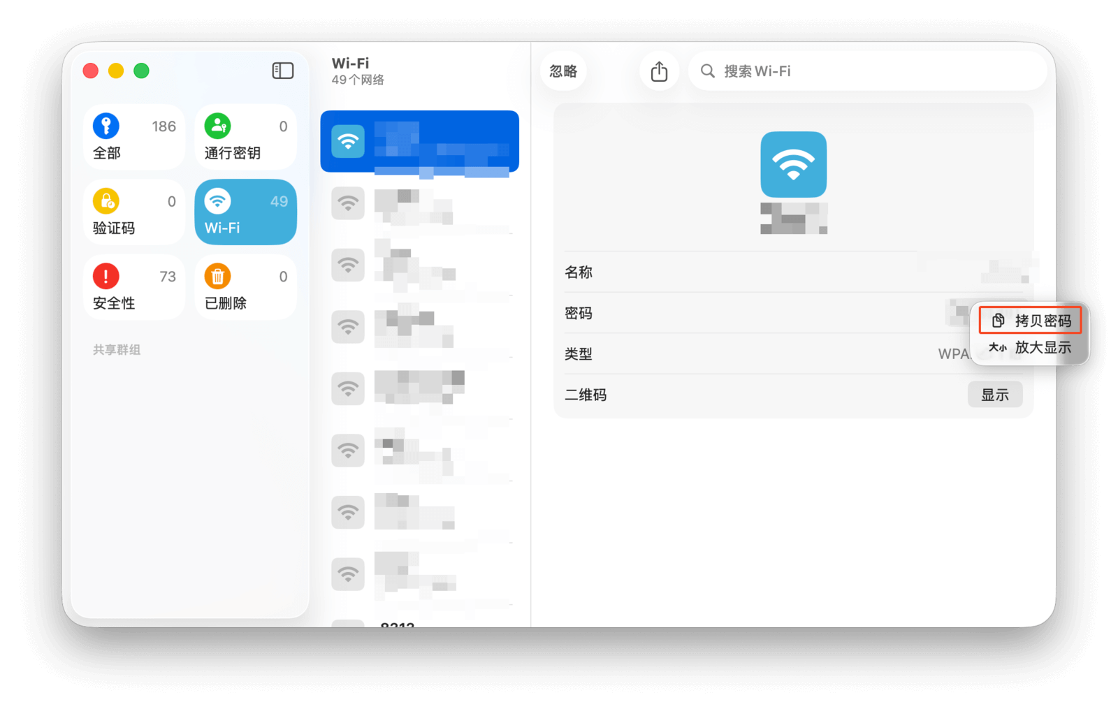 另一种方式是在密码 app 中查看。打开应用后,选择「Wi-Fi 密码」类别,在列表中找到相应的 Wi-Fi,就可以在详情页中直接查看或拷贝密码。