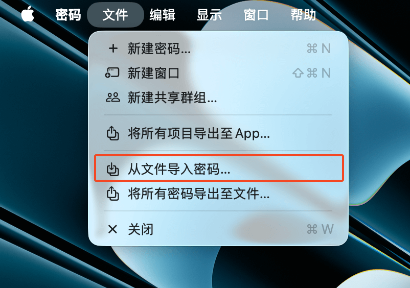 首先,你需要从之前使用的密码管理器中以「.csv」格式导出密码,大多数浏览器和密码管理器都提供了这个选项。然后,在密码 app 的菜单栏中前往「文件 > 从…导入」,并选择本地路径中刚刚导出的「.csv」文件即可。