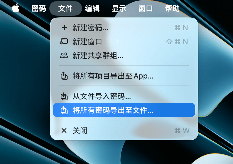如果你想导出密码 app 中的所有密码,在菜单栏中选择「文件 > 导出所有密码…」,就能以「.csv」格式导出。请注意,导出的文件包含密码明文,务必妥善保管,以防泄漏。