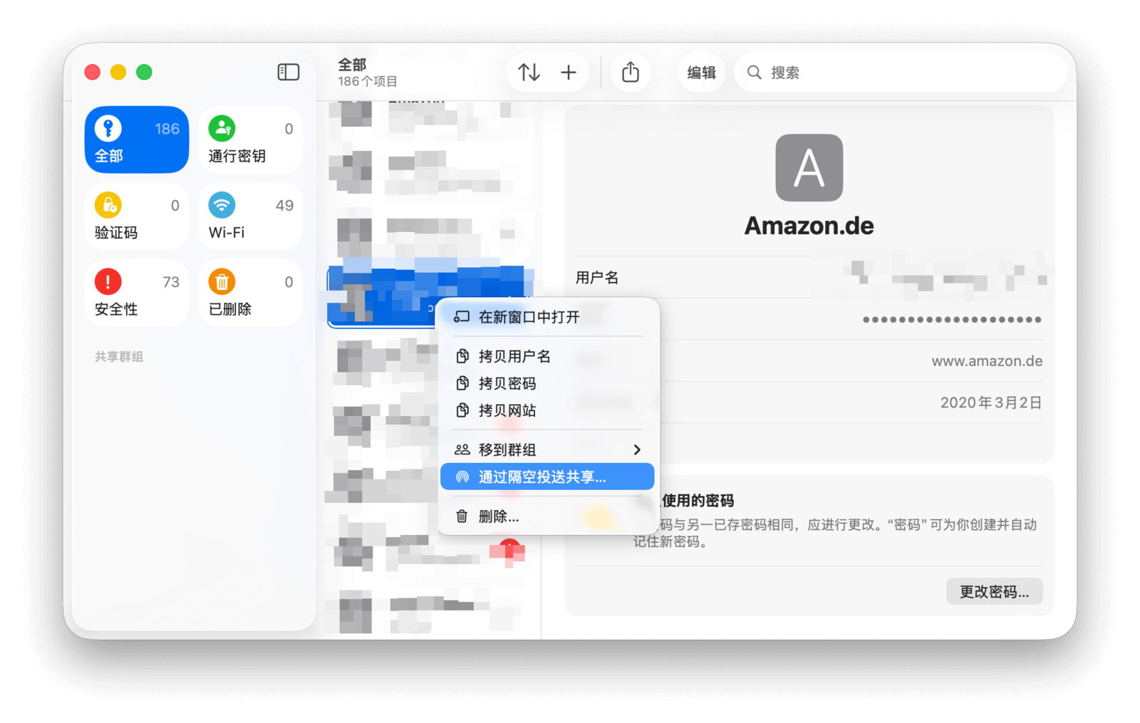然后,打开密码 app,通过密码或触控 ID 解锁后,选择需要分享的账号。在右侧详情页中,单击「隔空投送」按钮,并选择要发送的设备即可。