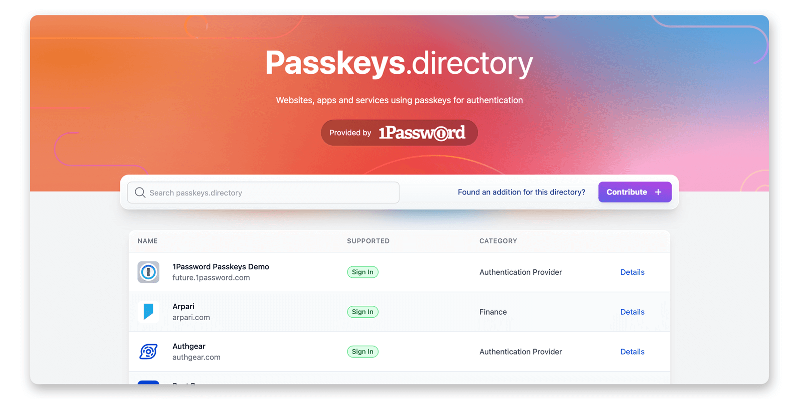 除了系统和软件的支持,我们最关心的还是哪些网站支持通行密钥。1Password 目前维护了一个支持通行密钥的 网站列表,详细列出了各网站的支持情况(是用于登录还是仅用于两步验证),并给出了设置地址。