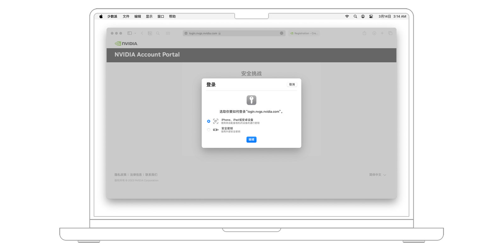以英伟达的官网账号为例,在登录页面的底部可以看到一个名为「使用安全设备登录」的选项,点击后即可通过支持通行密钥的浏览器、安卓或 iOS 设备登录你的账号。