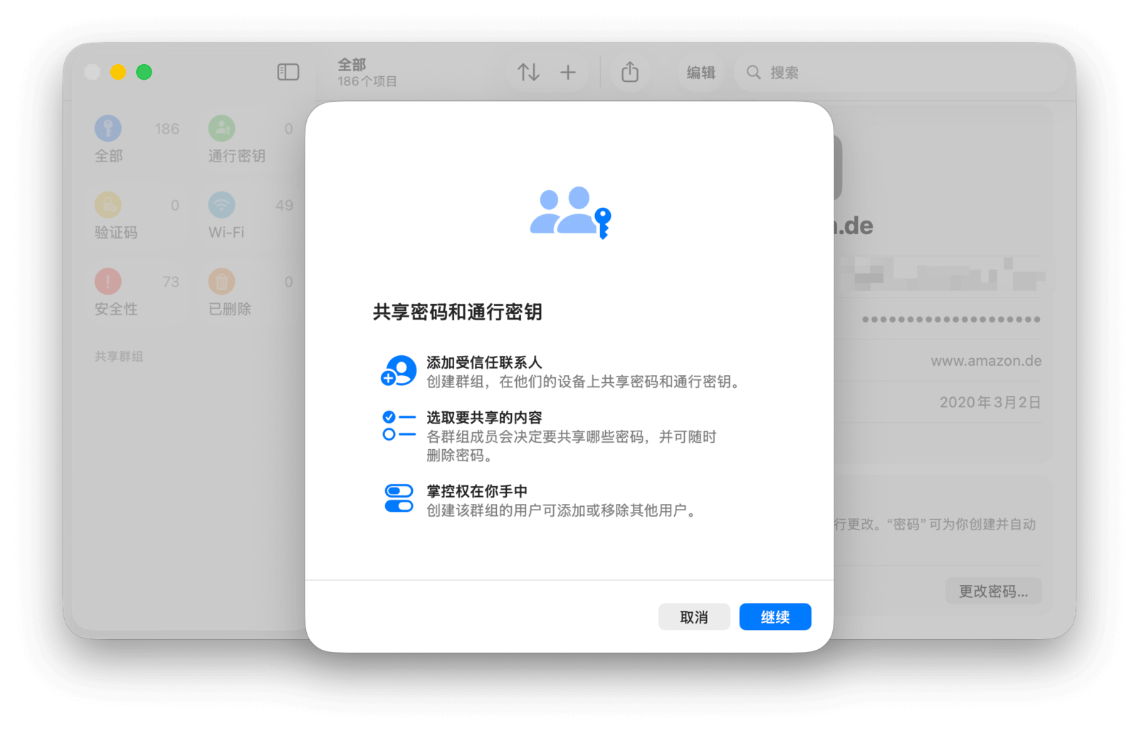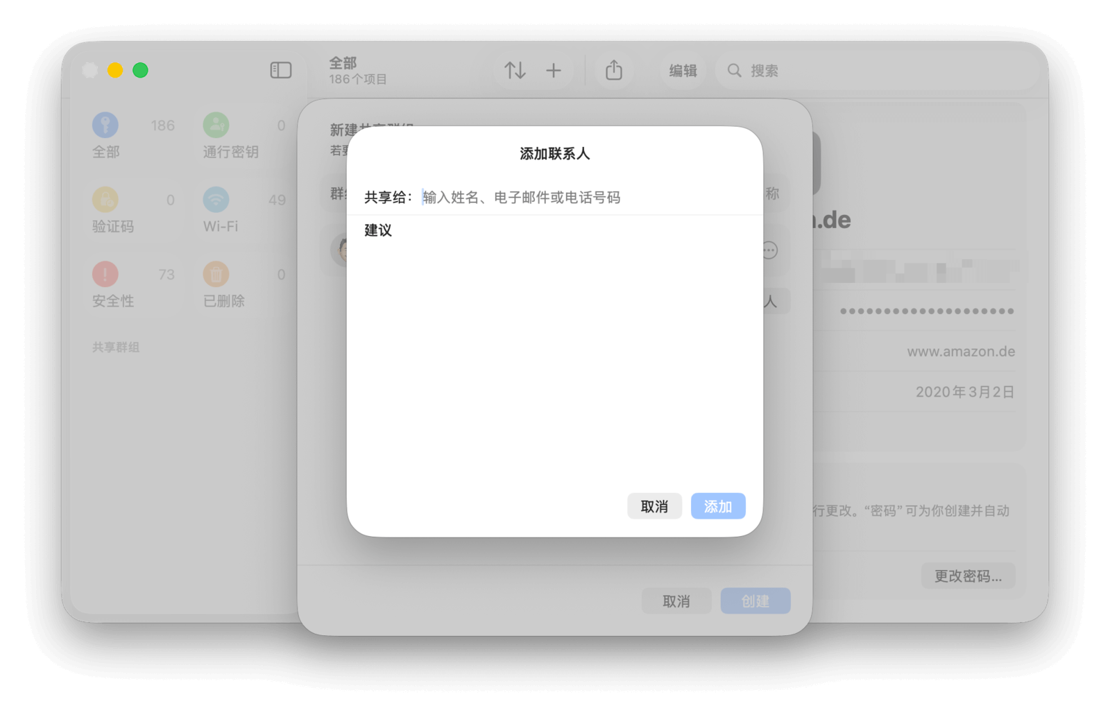 在 macOS Sonoma 版本中,苹果为密码和通行密钥加入了与家庭成员共享的功能。在密码 app 中,点击左侧「共享」标题旁的「+」按钮,即可根据步骤设置共享群组。