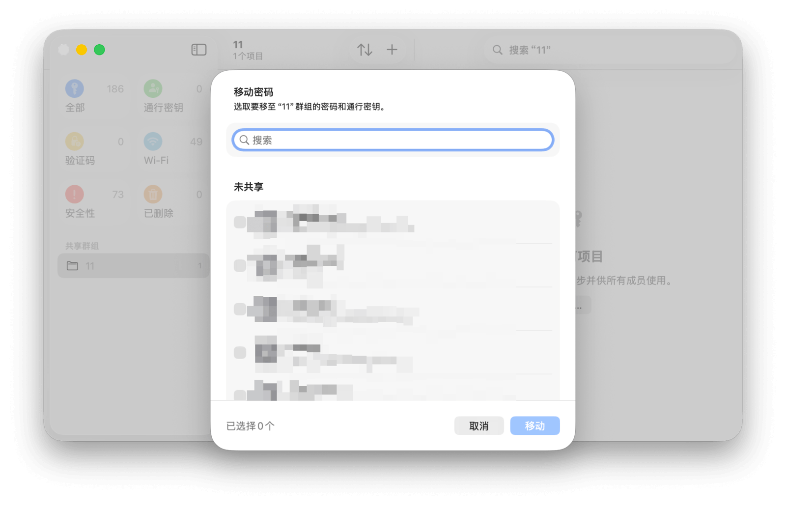 第二步,选择需要移入共享群组的密码,然后点击「移动」完成创建。