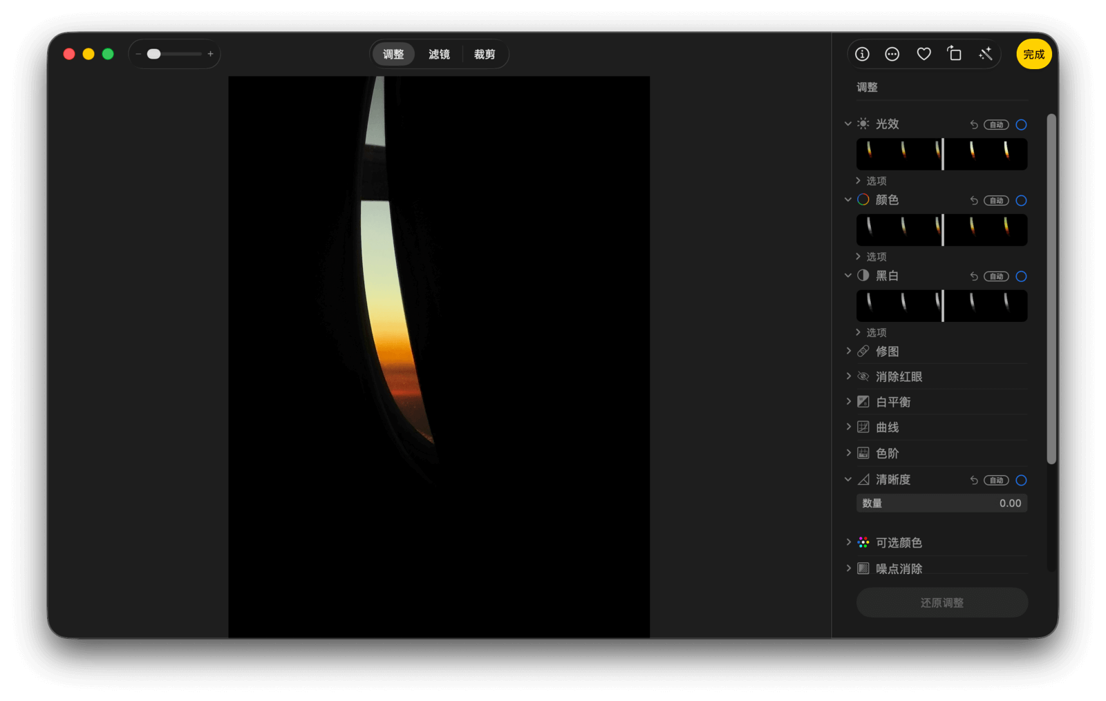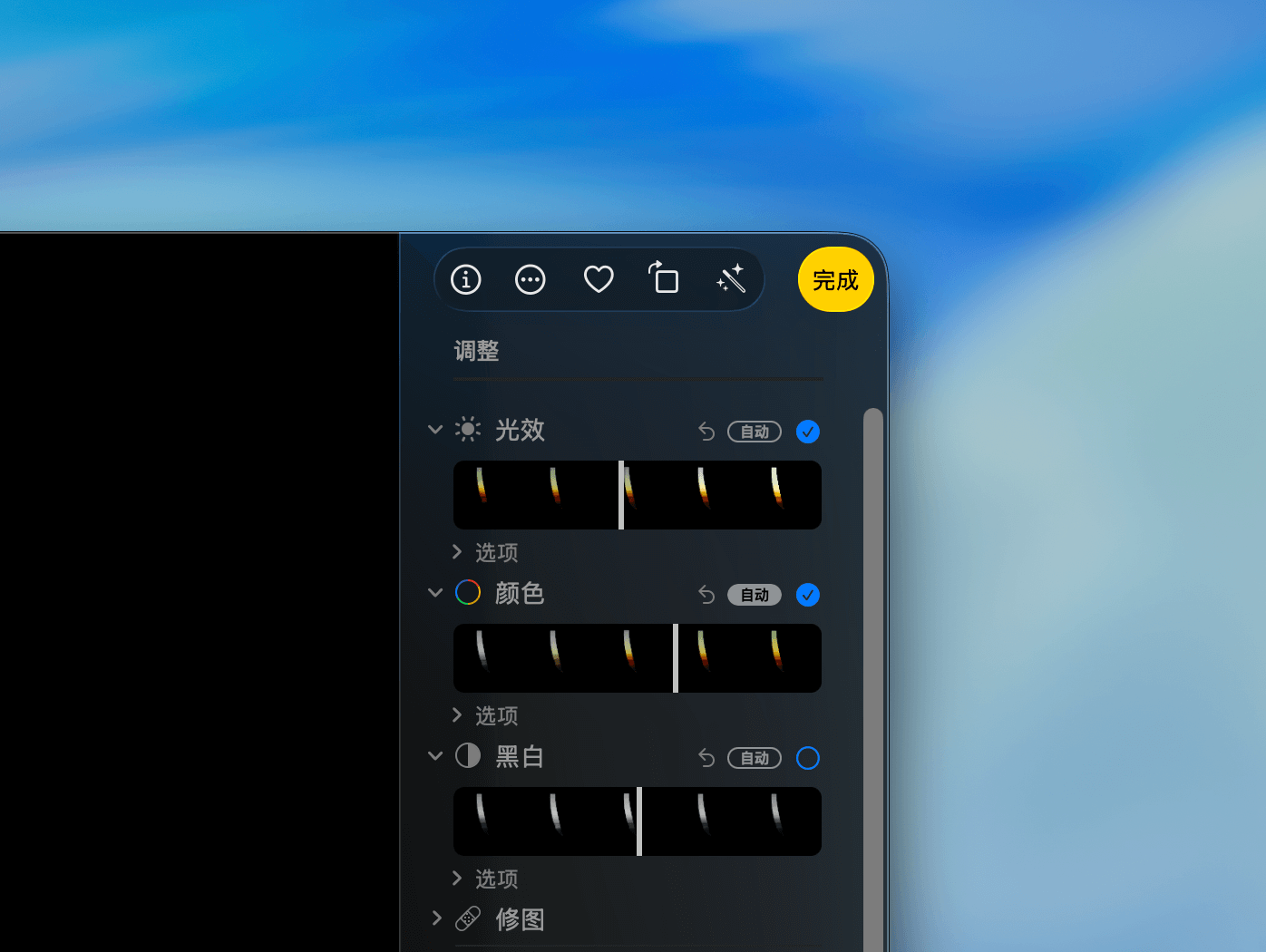 与 iOS 版相比,macOS 上的照片应用提供了更丰富的编辑功能,可以实现更强大的效果。此外,Mac 的大屏幕不仅能展示更丰富的画面细节,也为参数调整带来了更佳的体验。
