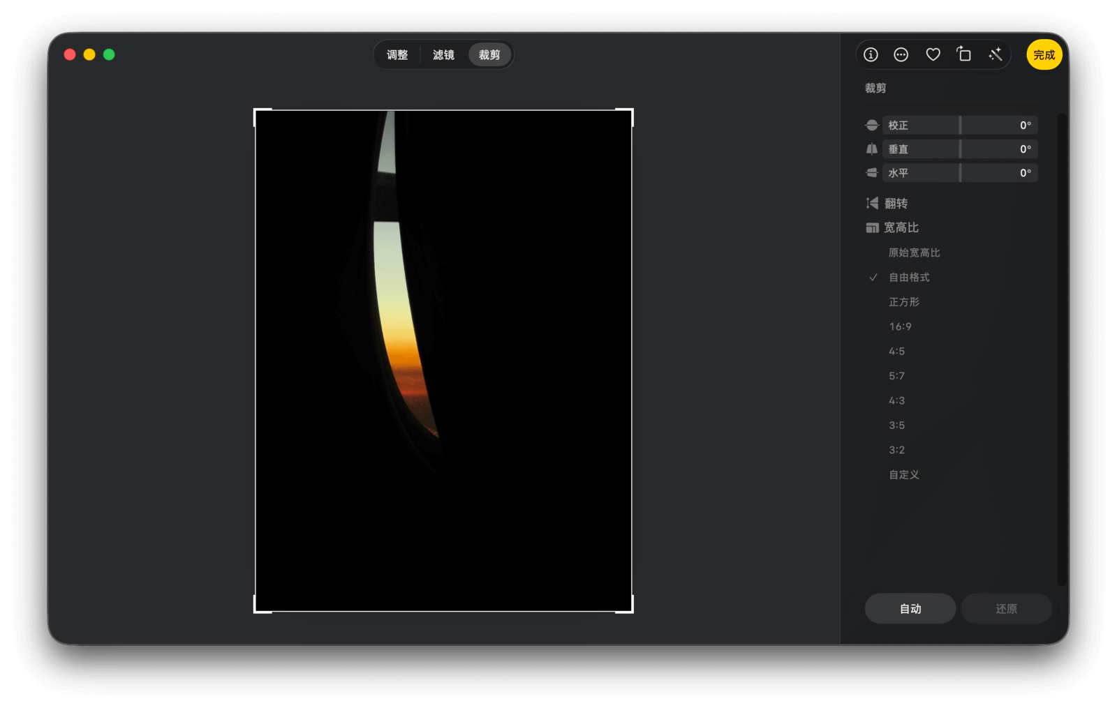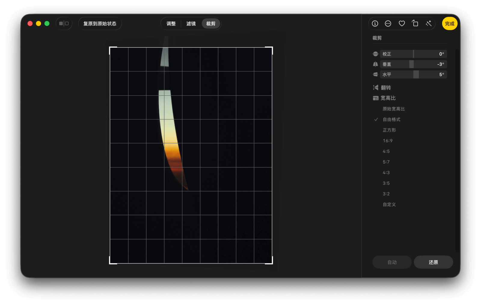 • 第二个是「复原到原始状态」:点击此按钮可一键撤销所有调整、滤镜和裁剪,将照片恢复原状。