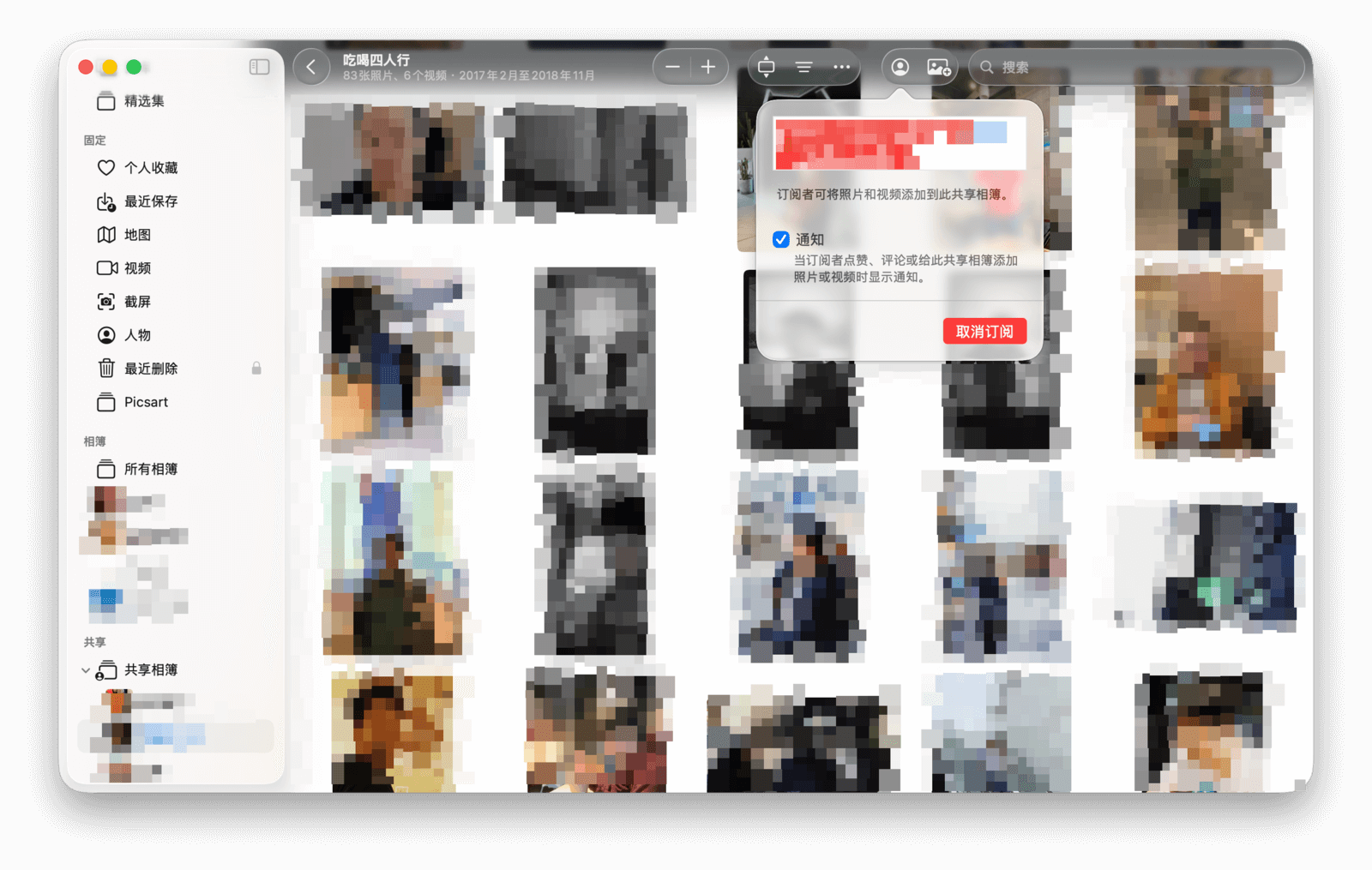 开启后,照片应用的侧边栏中会出现「共享」模块。在这里,你既可以与亲朋好友分享自己的精彩瞬间,也能浏览他们分享的美好点滴。
