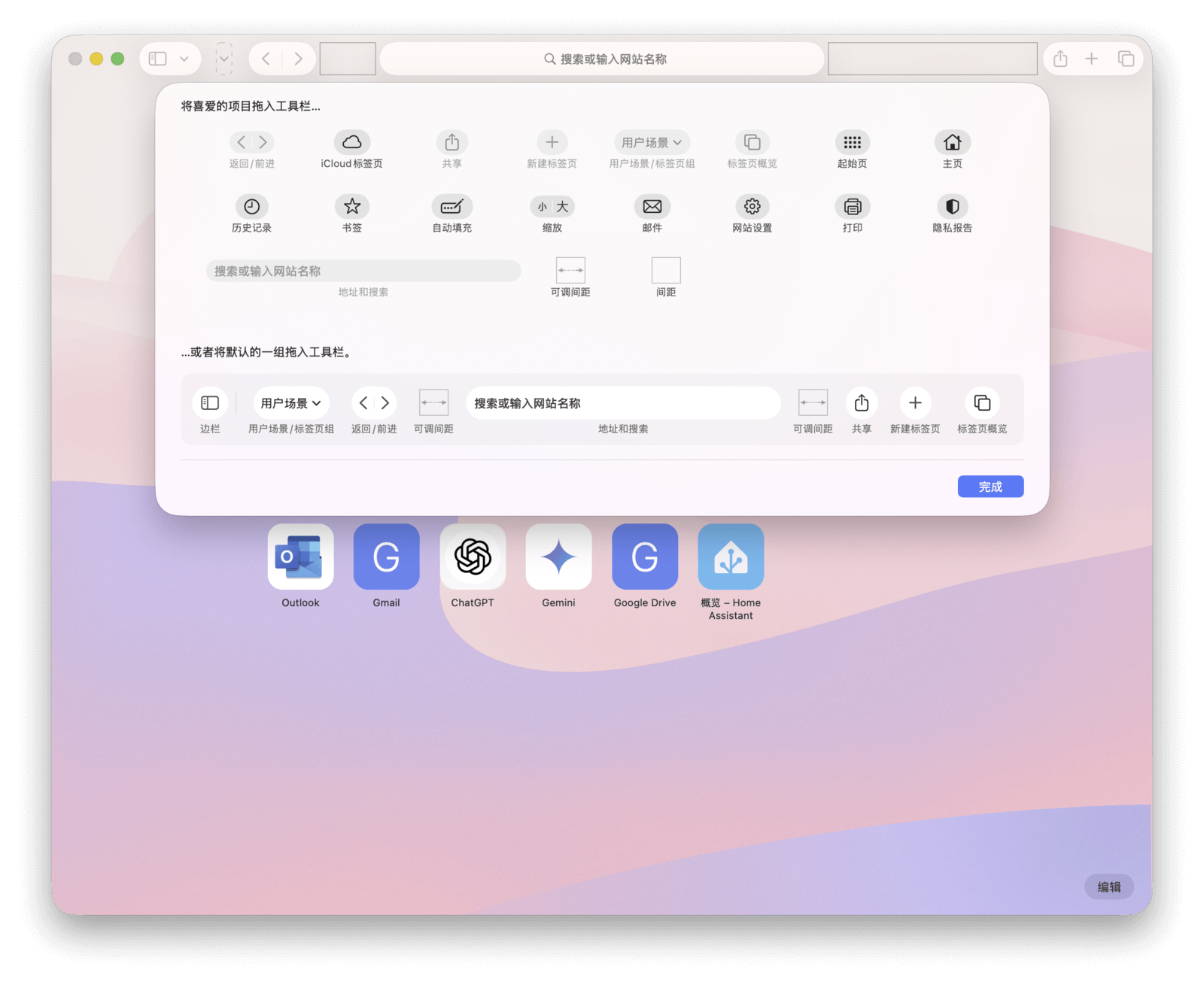 在浏览器的工具栏上右键,选择「自定工具栏」,即可进入个性化设置模式。你可以将常用的项目直接拖入工具栏,并按自己的使用习惯排列。