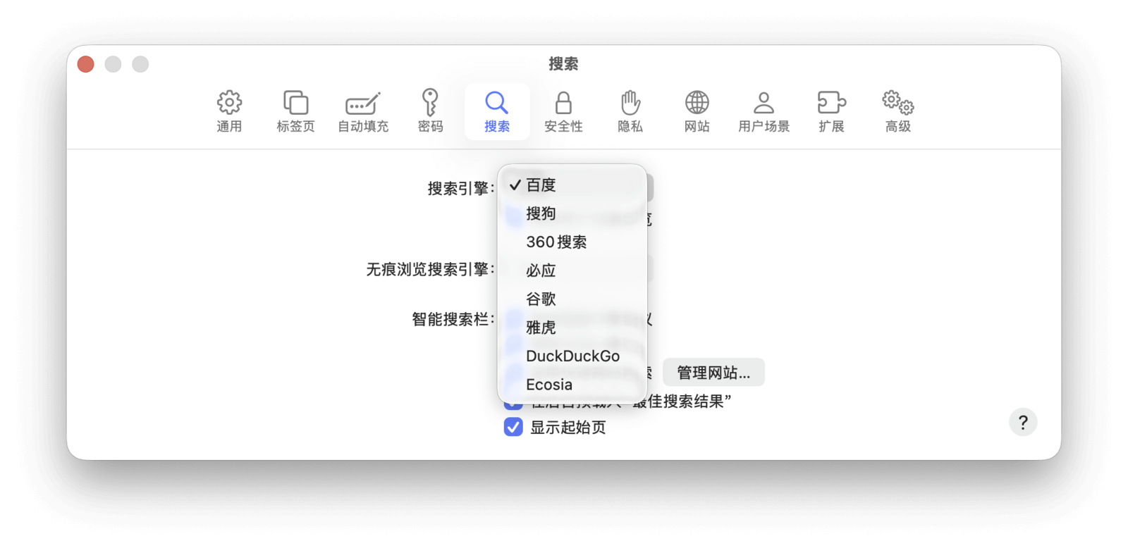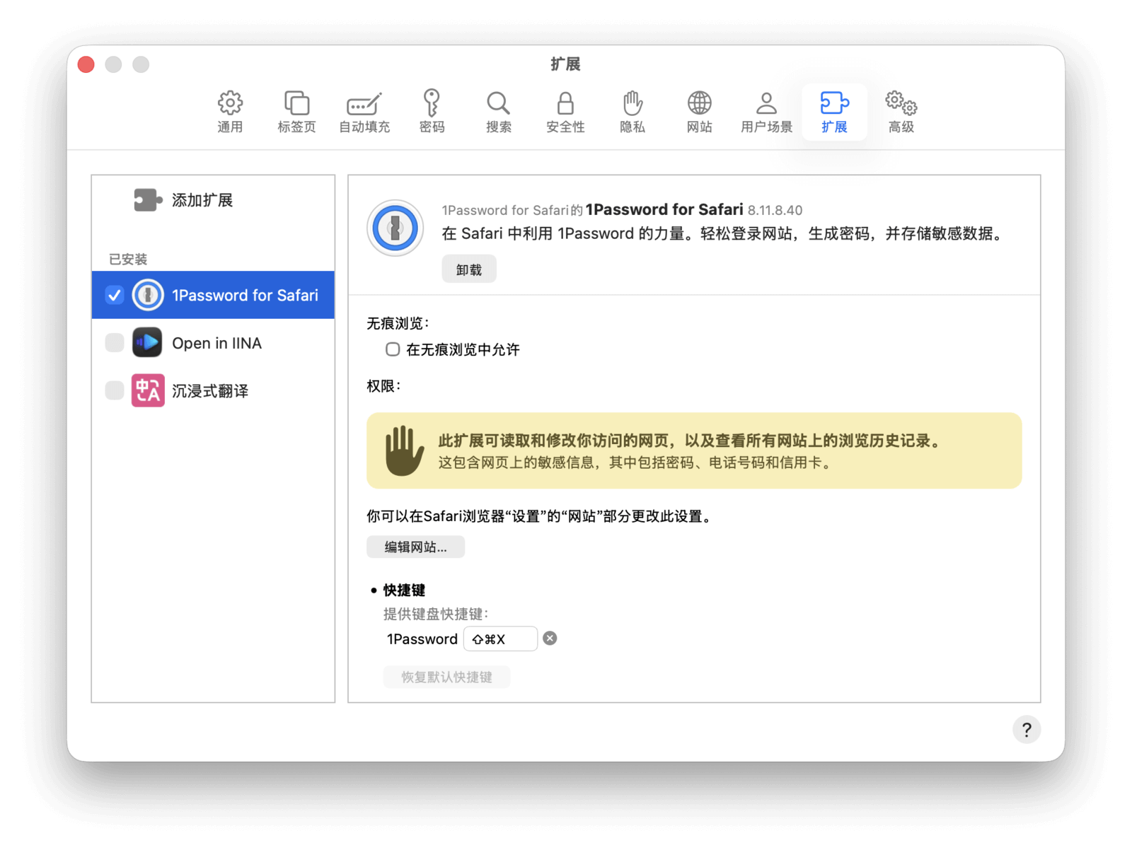 在顶部菜单栏中,点击「Safari 浏览器」>「设置」,然后点击「扩展」,即可查看所有已安装的扩展。你可以在此通过勾选来启用或停用扩展,也可以卸载不再需要的扩展。