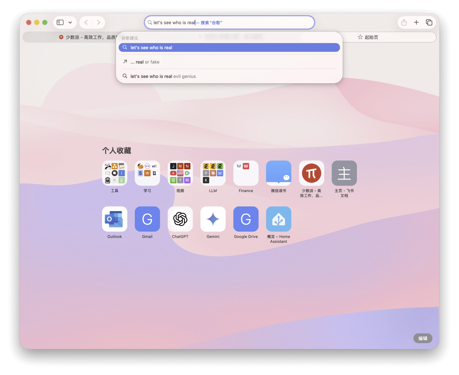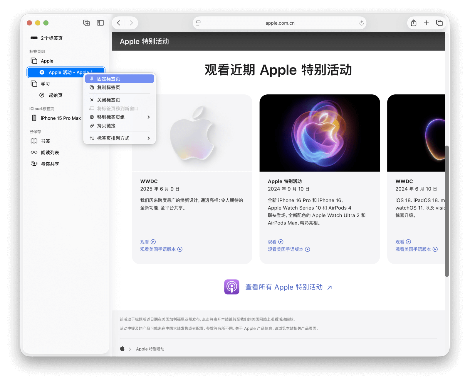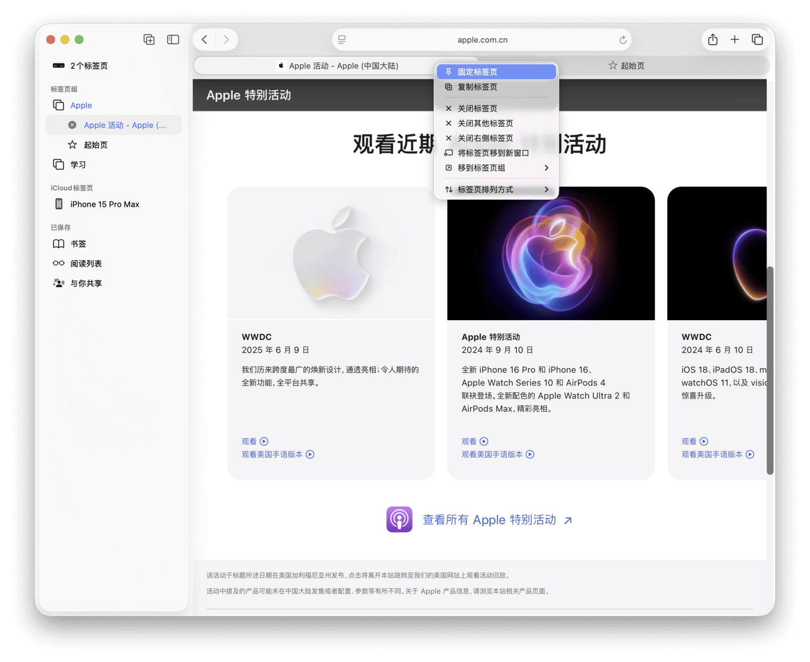 所有标签页组都支持「固定标签页」,被固定的网页会在每次切换到该分组时自动打开。此外,通过 Safari 左上角的按钮,可以直接在各个标签页组之间切换,无需打开侧边栏。