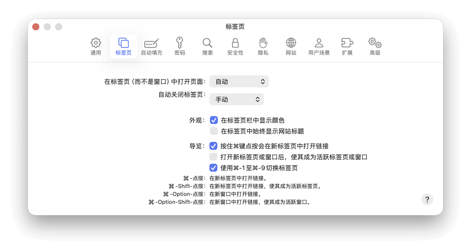 你可以通过勾选「按住 ⌘ 键点按会在新标签页中打开链接」来调整组合键的功能,具体效果请根据你的使用习惯进行设置。
