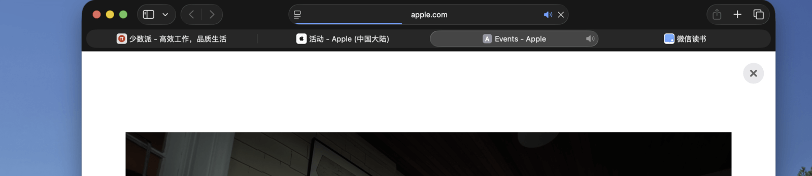 苹果也为 Safari 设计了类似的功能。当 Safari 在受支持的网站上检测到视频时,会将视频播放器前置并居中,同时将页面其余部分调暗。在视频播放器中,我们依然可以正常控制播放、暂停、音量和进度,还可以随时开启「画中画」模式,让视频窗口悬浮在桌面上。
