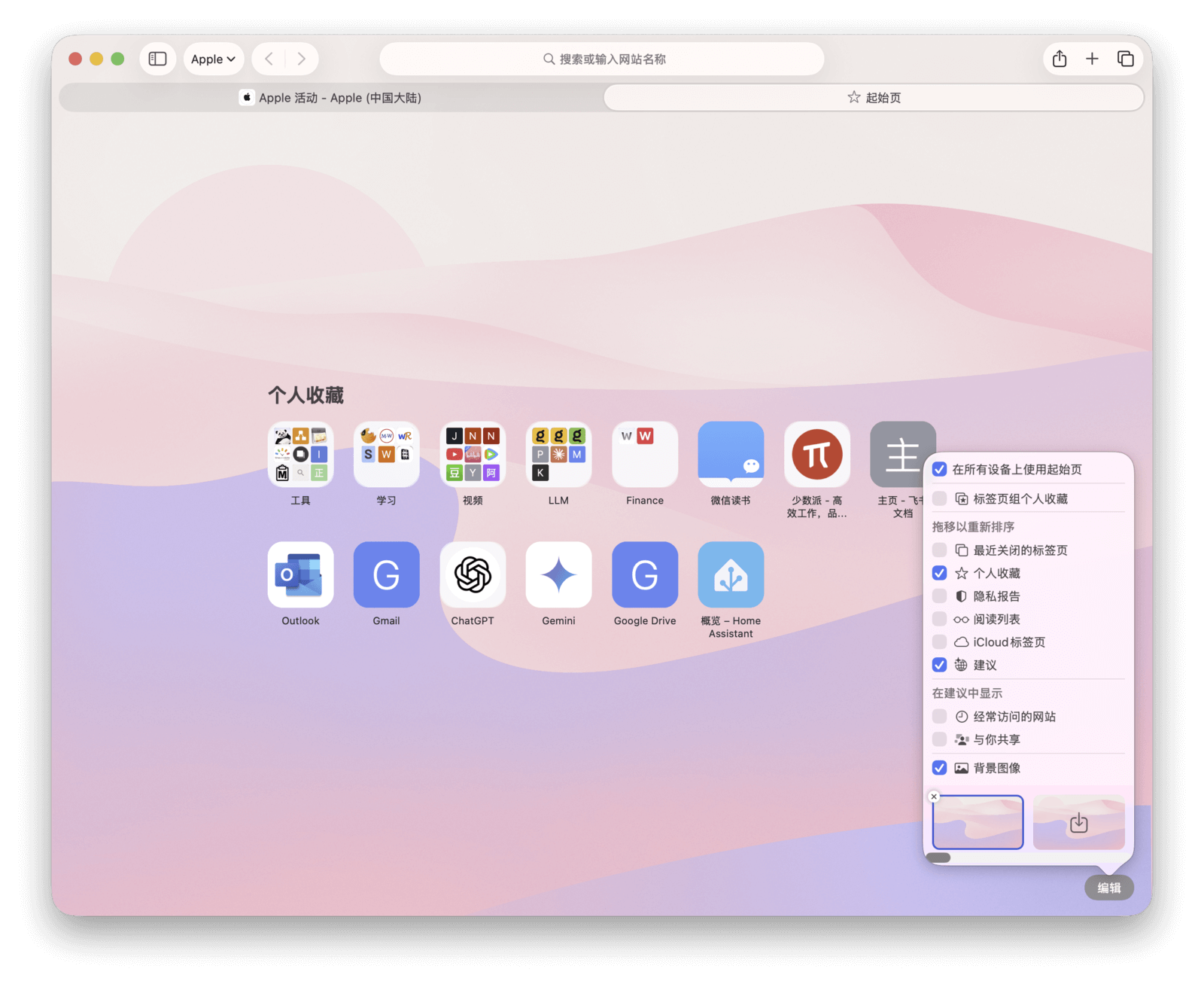 每个标签页组的起始页都可以自定义。你不仅能选取自己喜欢的壁纸,还可以自由选择起始页上要显示的元素,如个人收藏、经常访问的网站、隐私报告等。