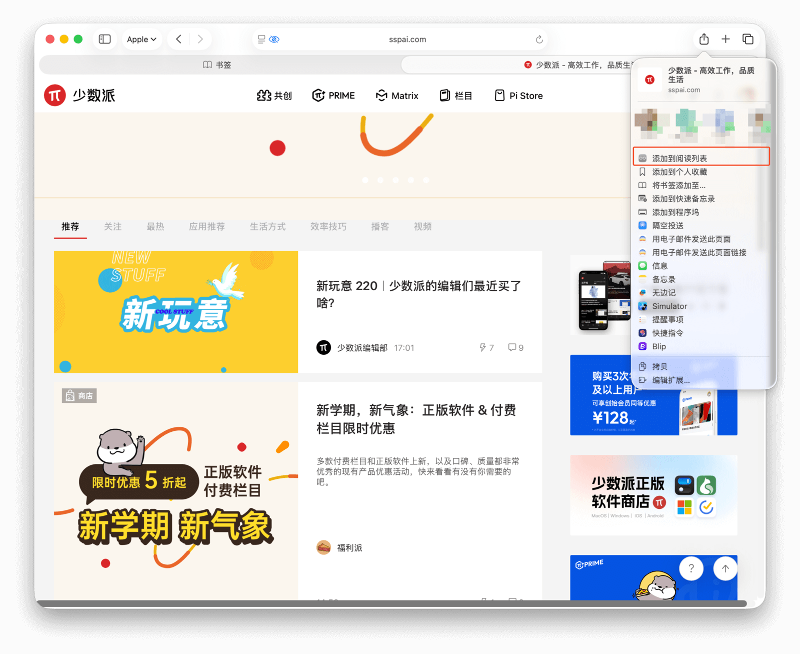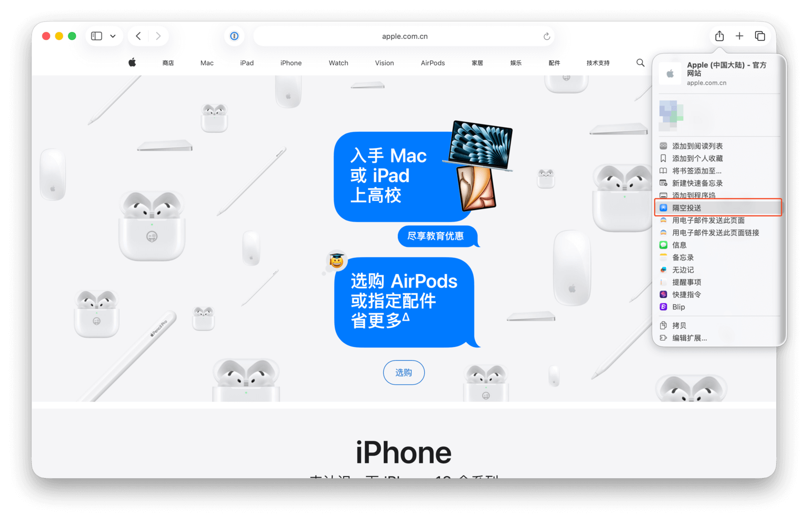 iCloud 的自动同步偶尔会有延迟。此时,你可以点击共享按钮,在下拉菜单中选择「隔空投送」,将网页快速发送到附近的其他 Apple 设备。顺带一提,你也可以将网页共享到第三方应用,比如通过微信或 QQ 发给联系人,或者直接发送到 Cubox 等 App 进行收藏。
