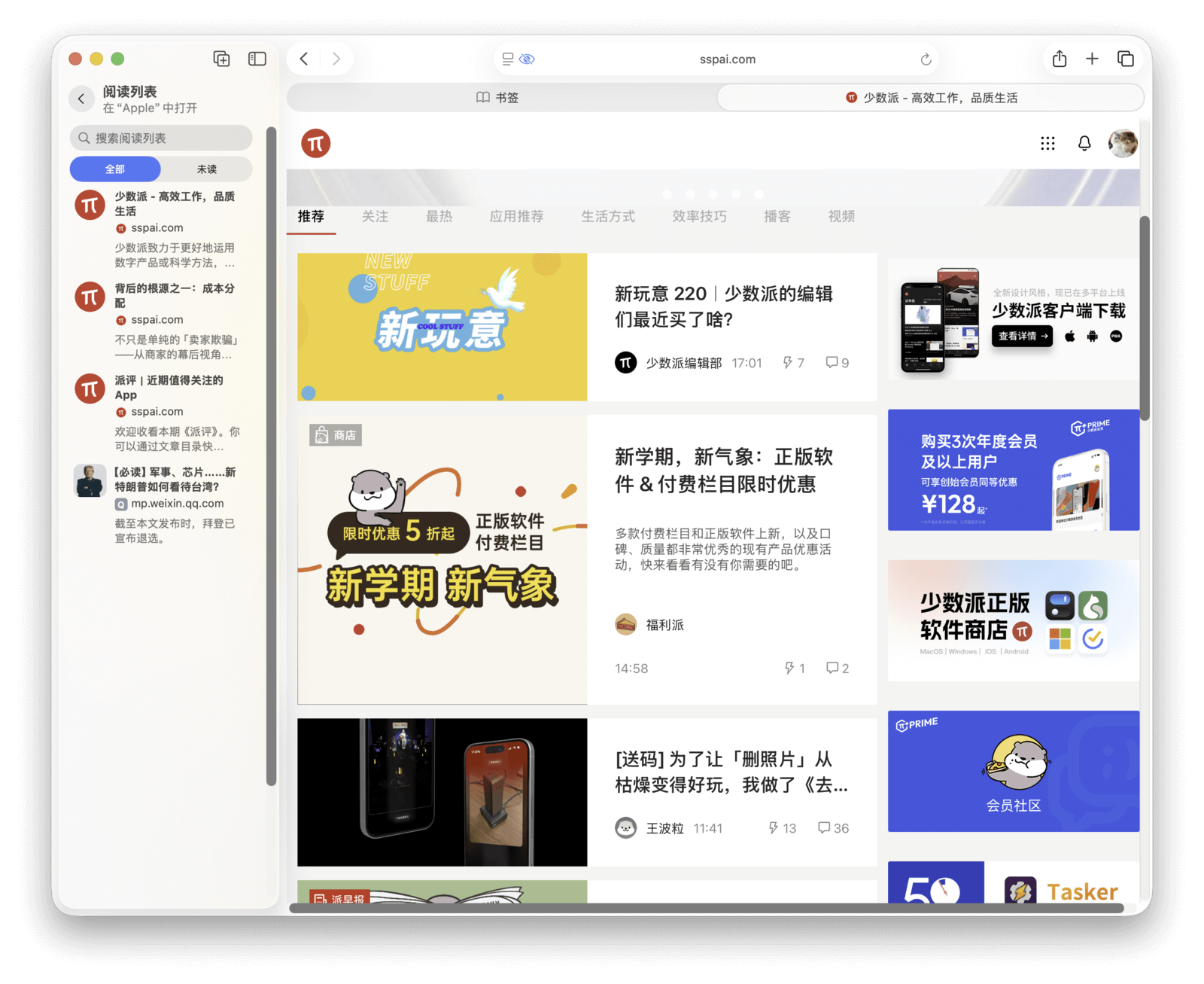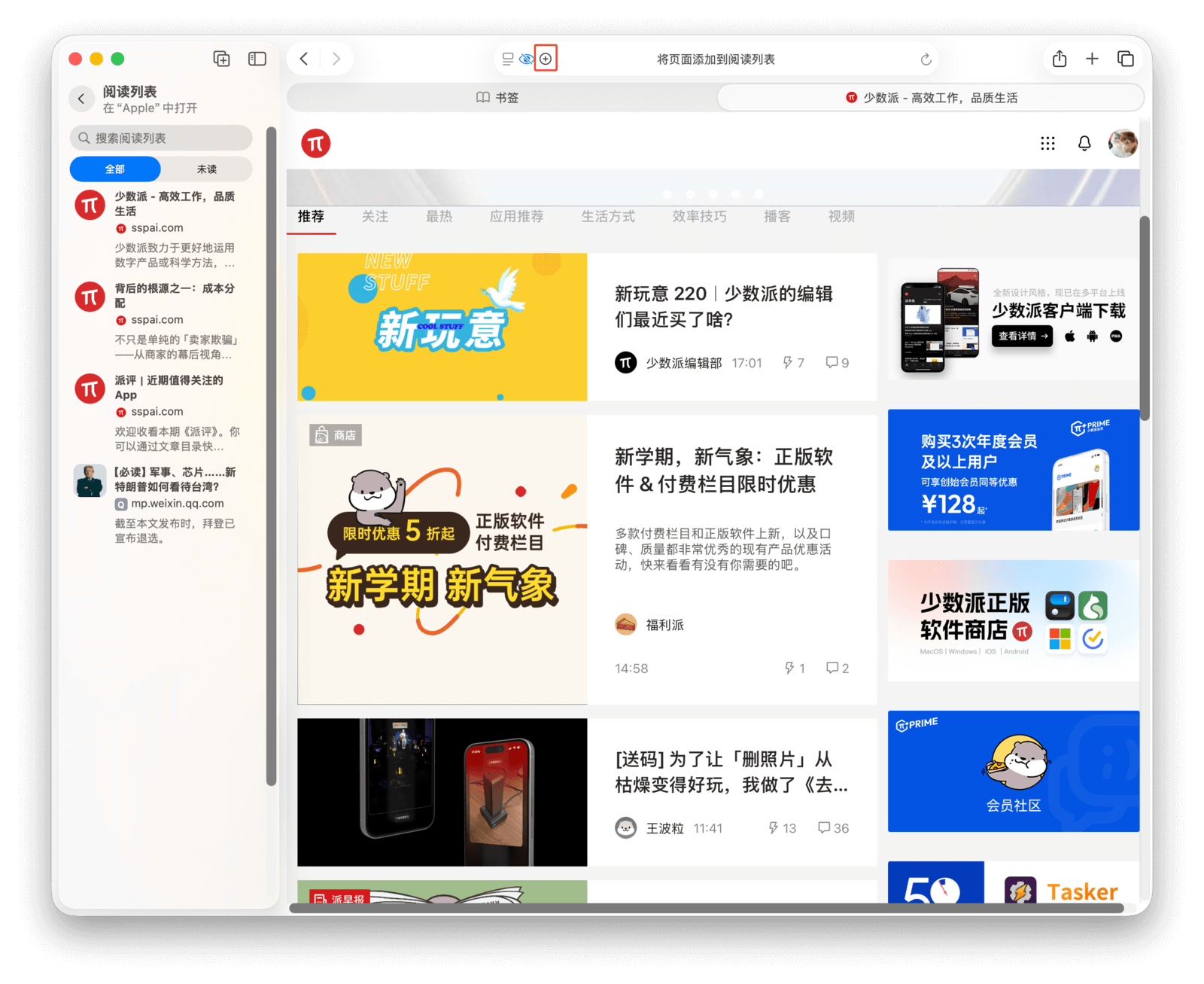 点击左上角的侧边栏按钮可以展开或收起侧边栏,在「阅读列表」中就能看到收藏的网页。列表顶部区分了「全部」和「未读」,方便检索。对于已读完的项目,可以右键将其删除。