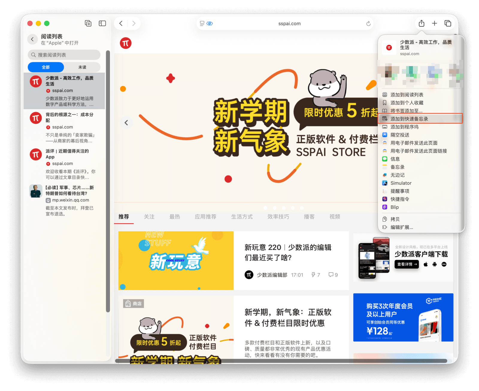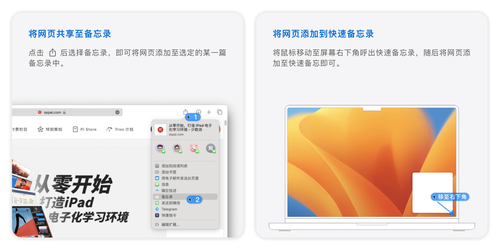 如果你在浏览网页时需要速记或整理思路,可以通过共享菜单中的「添加到快速备忘录」来实现,也可以将鼠标移动到桌面右下角来呼出新建备忘录,效果相同。