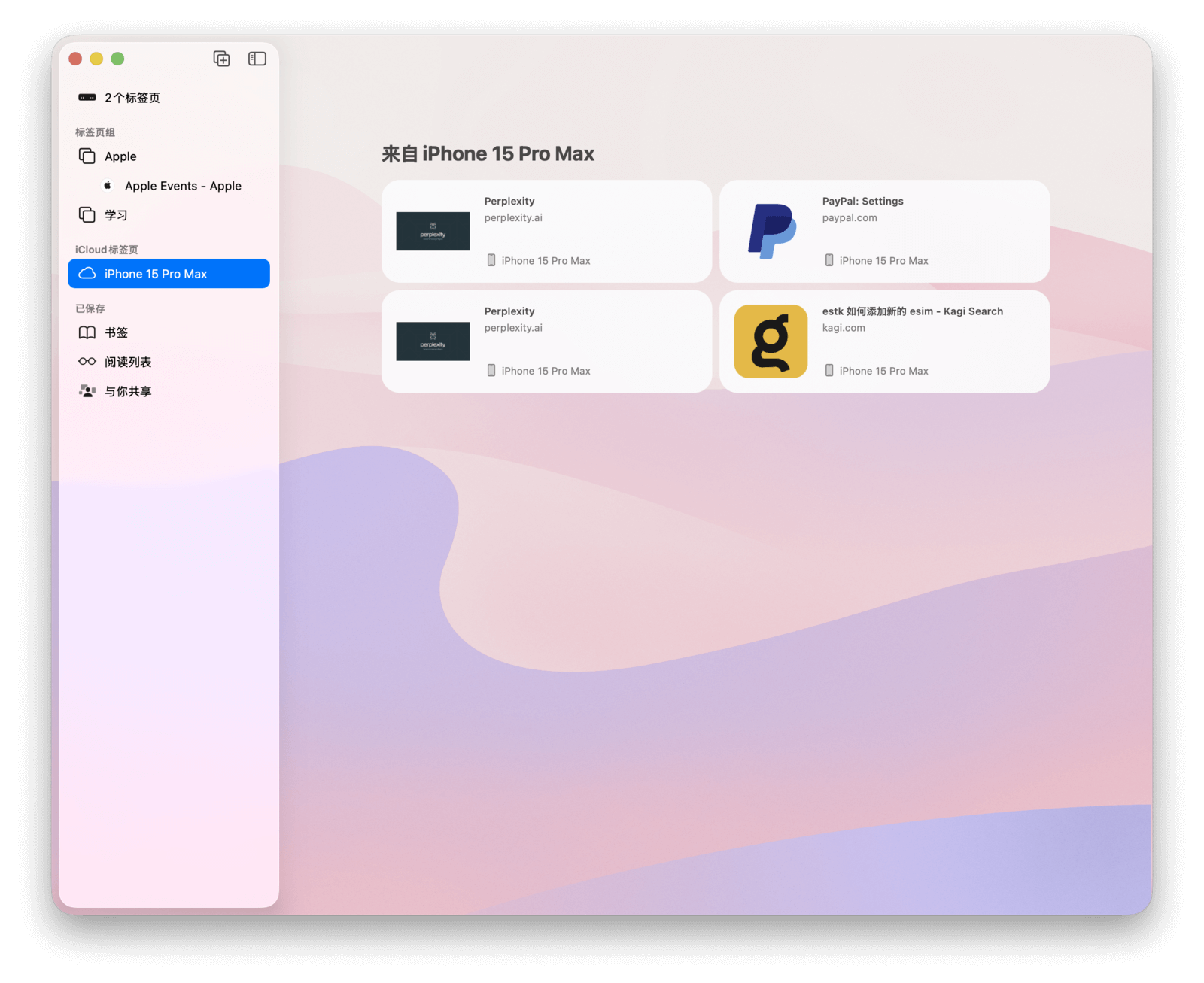 开启 Safari 的 iCloud 同步后,同一个 Apple ID 登录的设备间可以同步标签页组。在侧边栏中,苹果单独设置了一个「iCloud 标签页」分组,你所有设备上已打开的标签页都会按设备分类显示在此处,方便你随时切换打开。