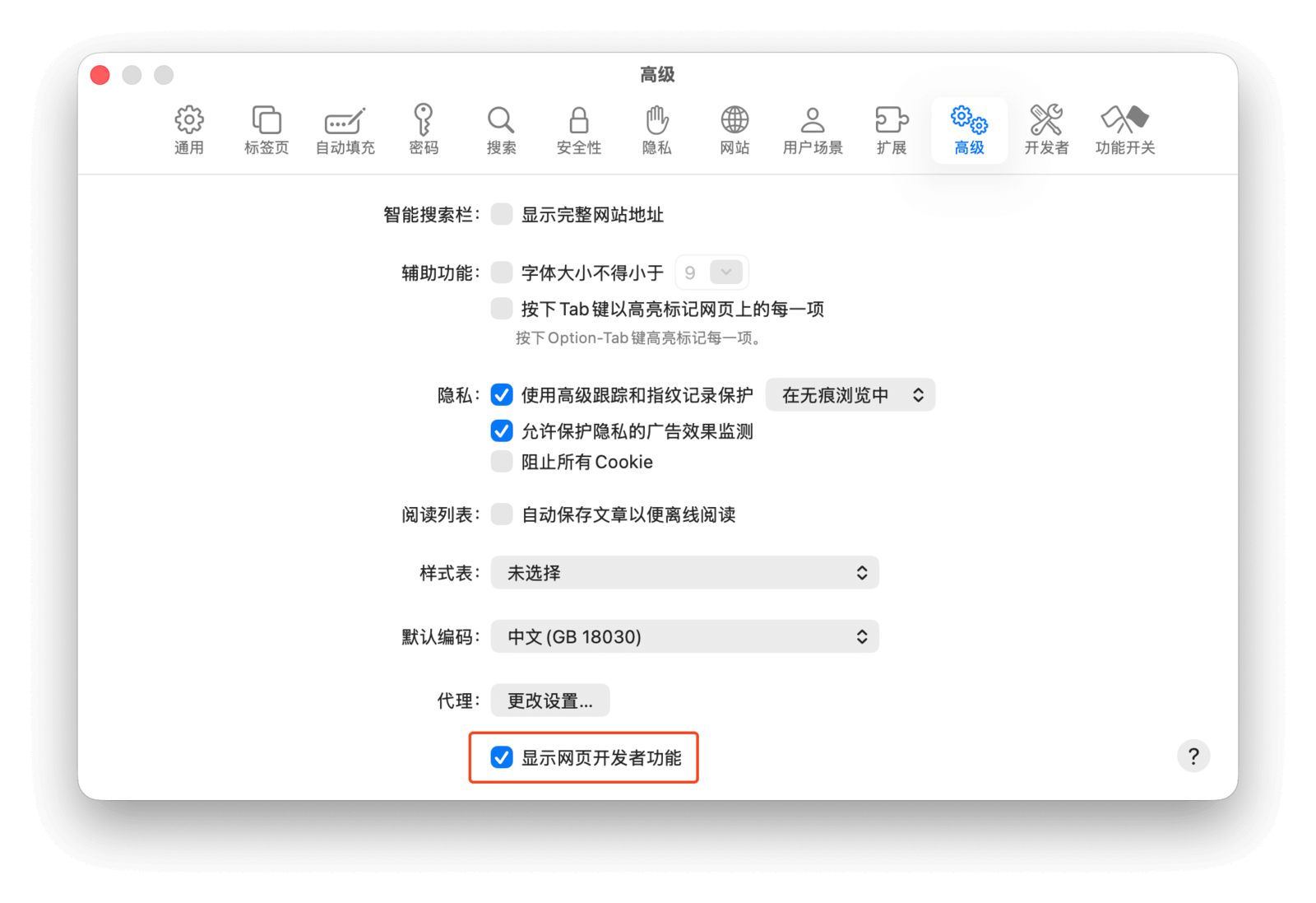 打开 Safari 浏览器设置中的「高级」选项卡,勾选最下方的「在菜单栏中显示『开发』菜单」。
