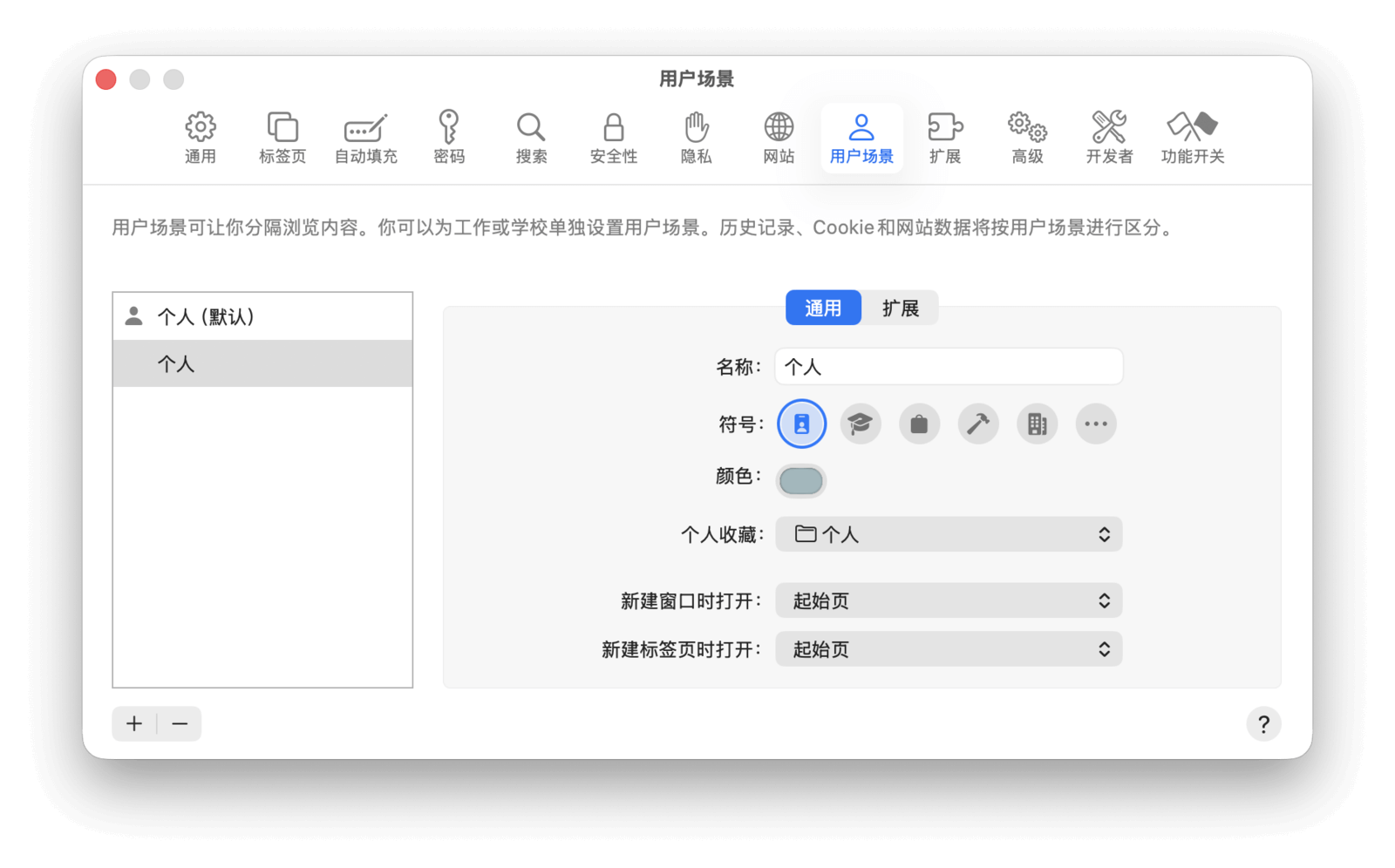 你可以通过「Safari 浏览器」>「设置」>「用户场景」来新增、删除或编辑用户场景。每个场景都可以单独设置名称、符号、颜色、个人收藏以及新建窗口或标签页时打开的页面。设置好后,每个用户场景就相当于一个独立的浏览器沙盒,互不干扰,且可以快速切换。