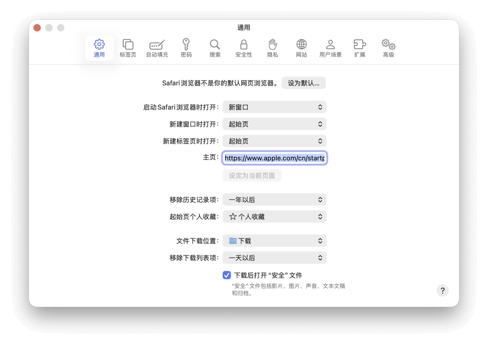在顶部菜单栏中选取「Safari 浏览器」>「设置」,然后点击「通用」。在「主页」一栏输入你想要的网址,即可完成主页设置。
