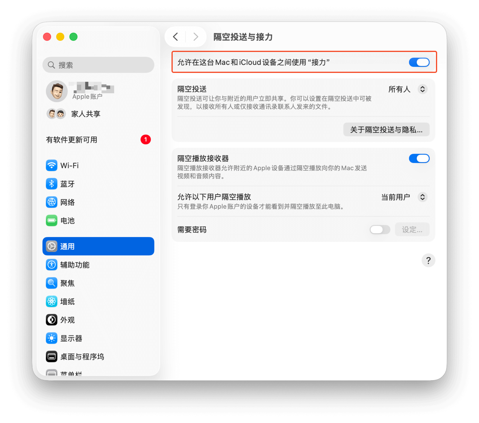 使用前,请确保在 Mac 的「系统设置 > 通用 > 隔空投送与接力」中,已经启用了「允许在这台 Mac 和 iCloud 设备之间使用接力」选项。在 iOS 设备上,请依次前往「设置 > 通用 > 隔空投送与接力」,然后启用「接力」。
