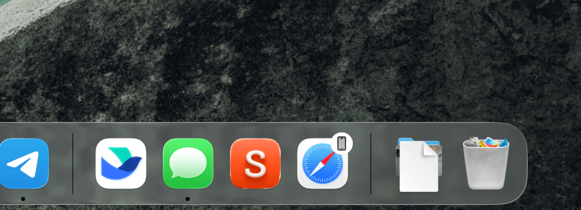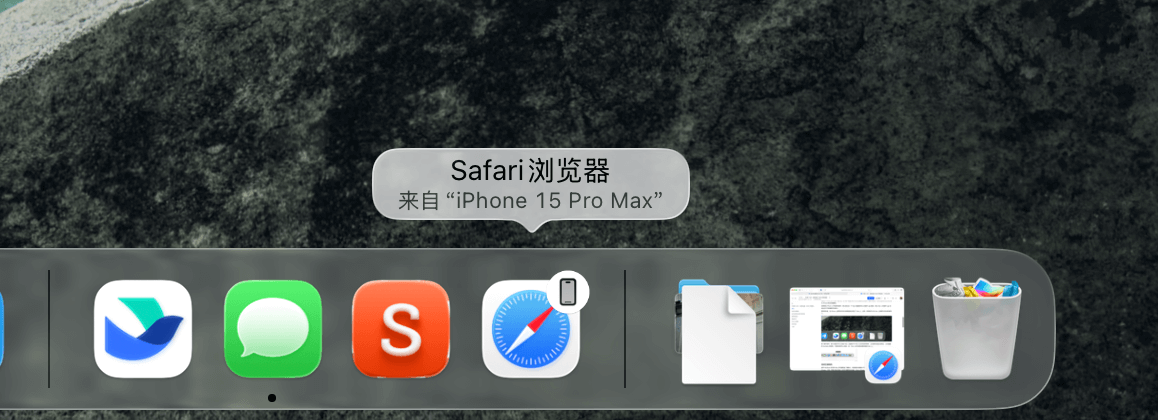 当我在 iPhone 上打开邮件 App 后,Mac 程序坞的右侧就会出现邮件 App 的图标,图标右上角还会显示一个 iPhone 样式的缩略图。
