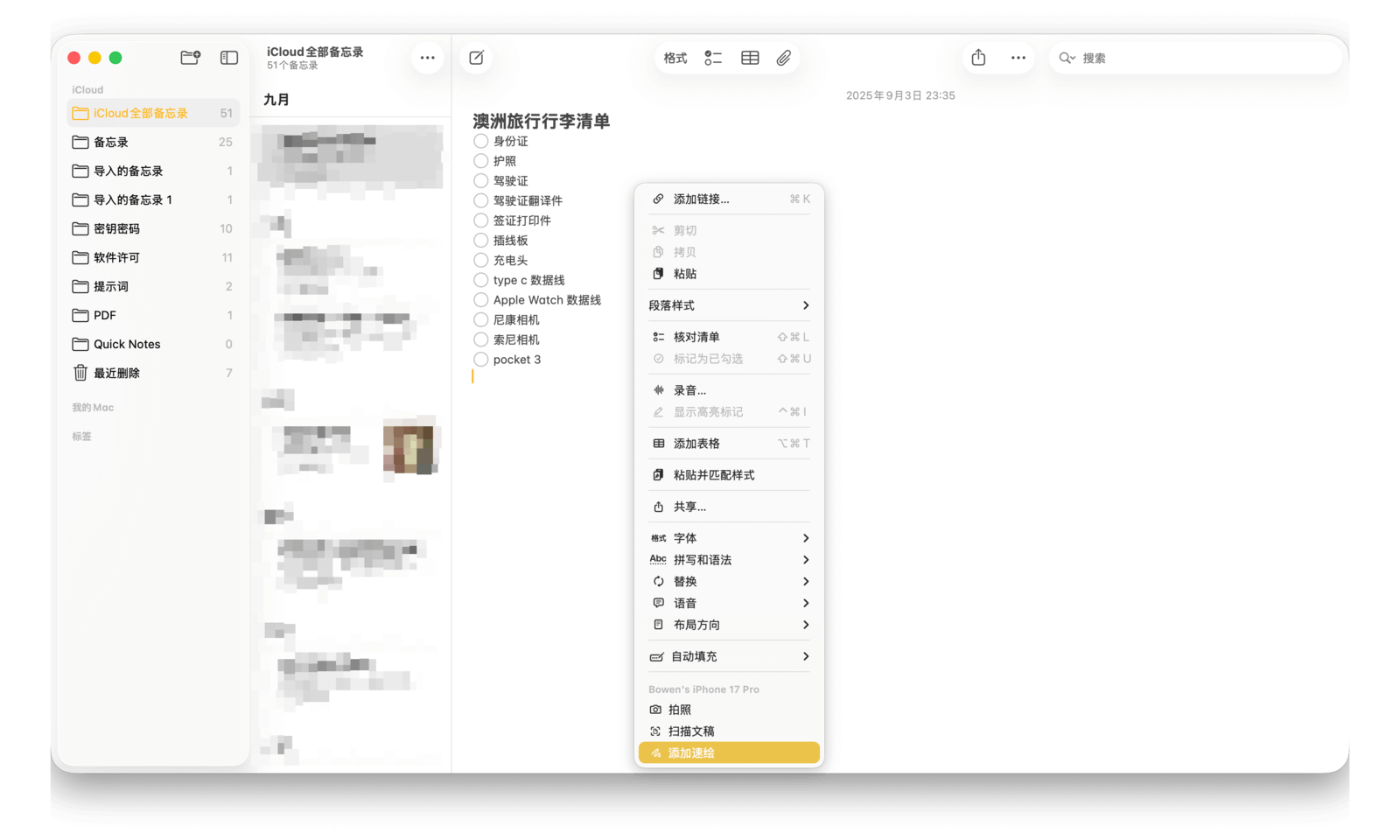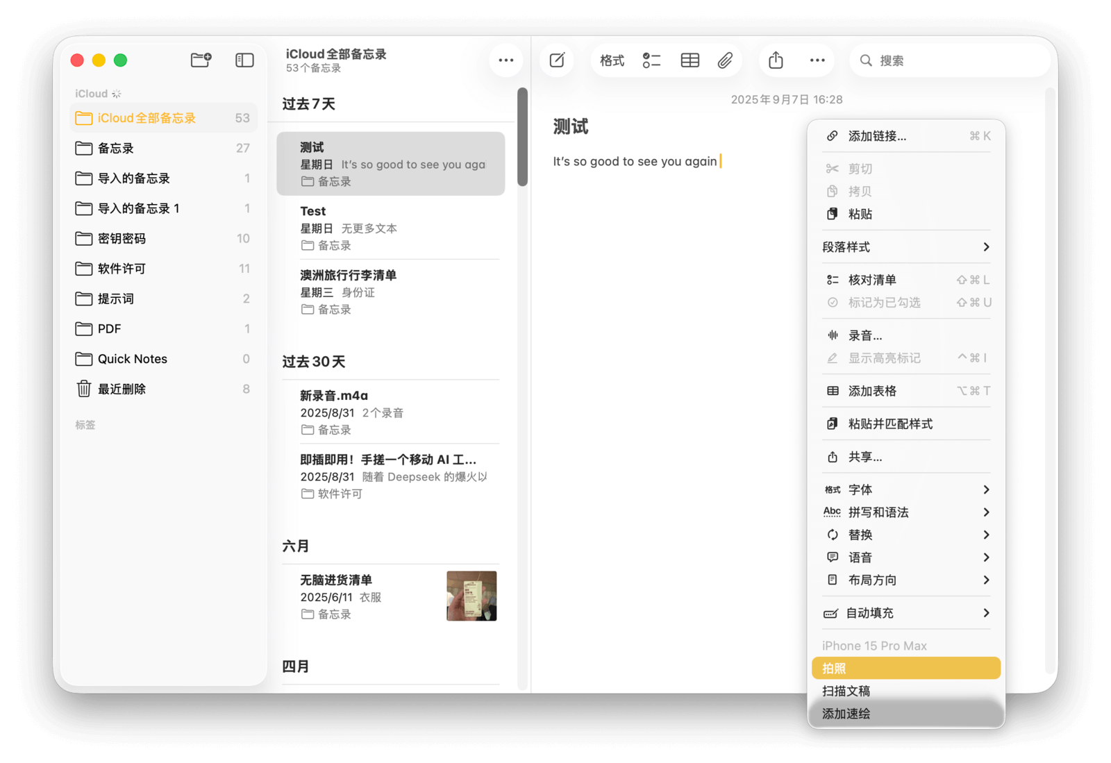 首先,Mac 可以将 iPhone 拍摄的照片或扫描的文稿直接插入到应用中。下面以备忘录为例,为你详细讲解如何通过连续互通相机快速插入照片。