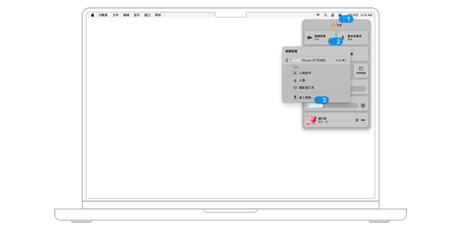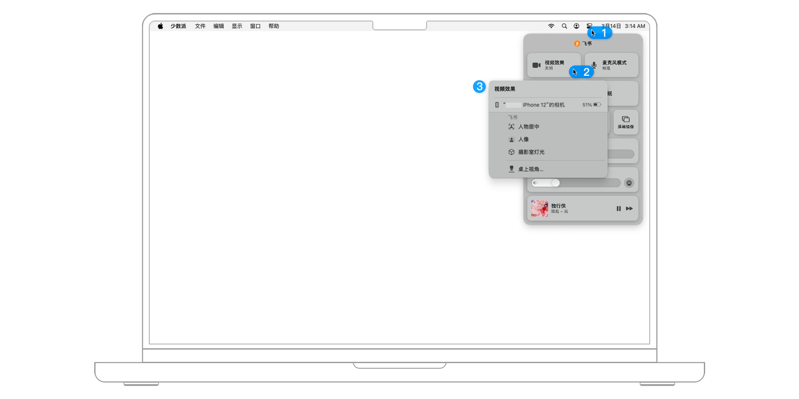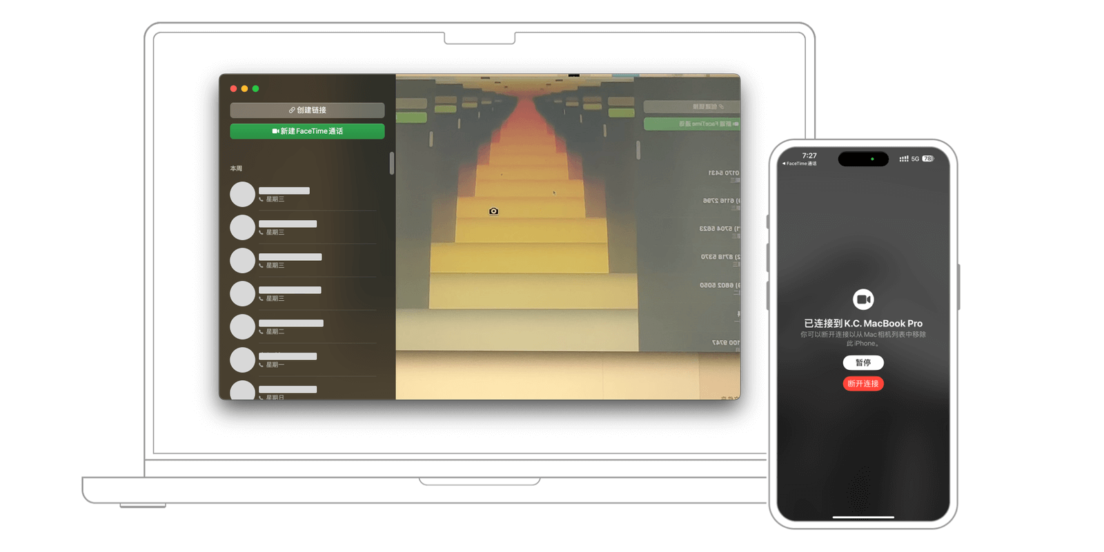 其次,Mac 可以在视频通话时直接调用 iPhone 的后置摄像头作为视频源。例如,在 Mac 上打开 FaceTime 通话 App,然后将 iPhone 靠近 Mac,Mac 就会自动将 iPhone 摄像头作为视频输入源,无需任何设置或连接。该功能需要 macOS Ventura 或更高版本。