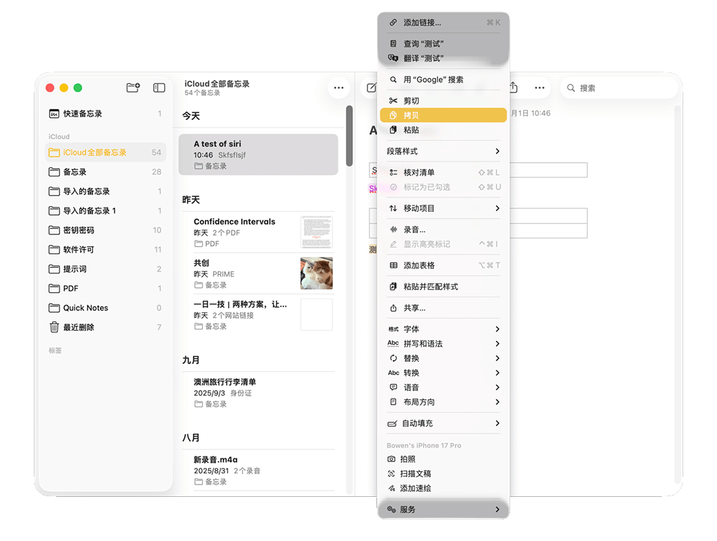 第一步,在备忘录的任意一条笔记中,在编辑区的空白处点按右键,就能在快捷菜单底部看到你的 iPhone 名称。