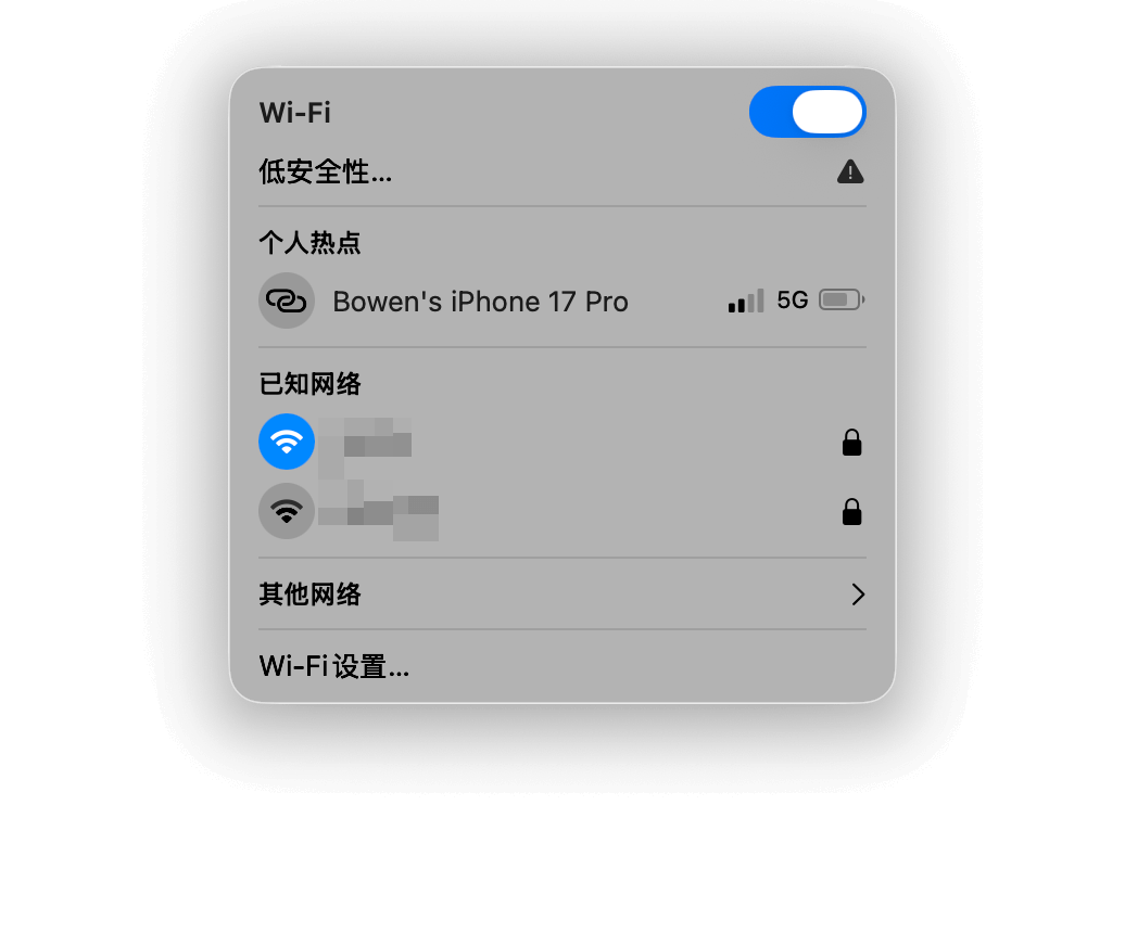 启用智能热点非常简单:只需点按 Mac 菜单栏中的 Wi-Fi 图标,然后在「个人热点」下选择你的 iPhone 或 iPad,即可直接连接,无需输入密码。