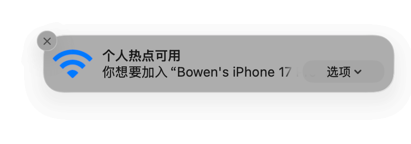 下次当 Mac 检测到没有网络连接时,系统会自动弹出连接智能热点的提示,只需点按「加入」即可一键连接,无需再从 Wi-Fi 菜单中选择。