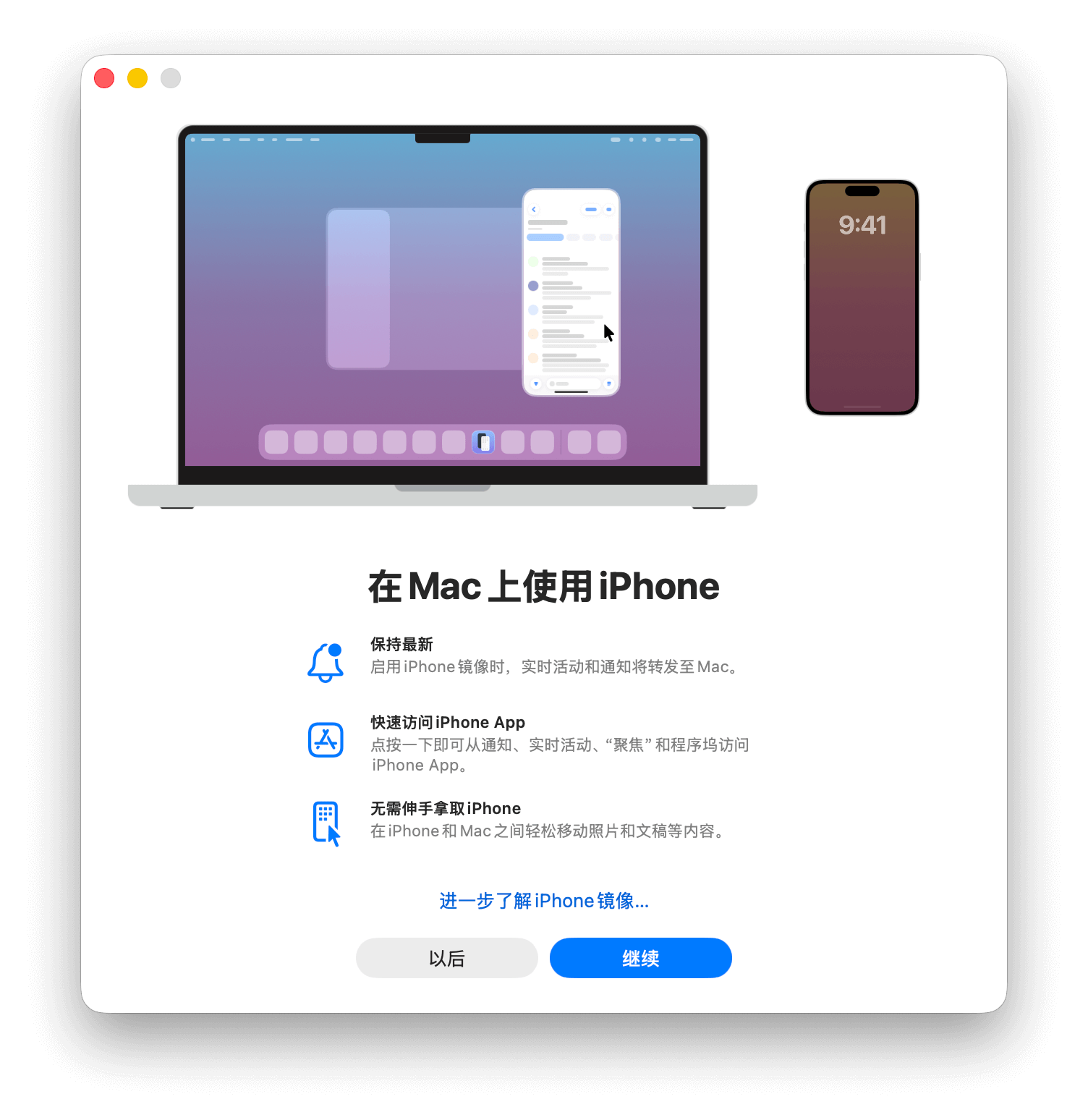 最后是连接:确保 iPhone 处于锁定状态,且两台设备的 Wi-Fi 和蓝牙均已开启。然后在 Mac 上打开「iPhone 镜像」App,即可自动完成无线连接(首次使用可能需要在 iPhone 上确认)。