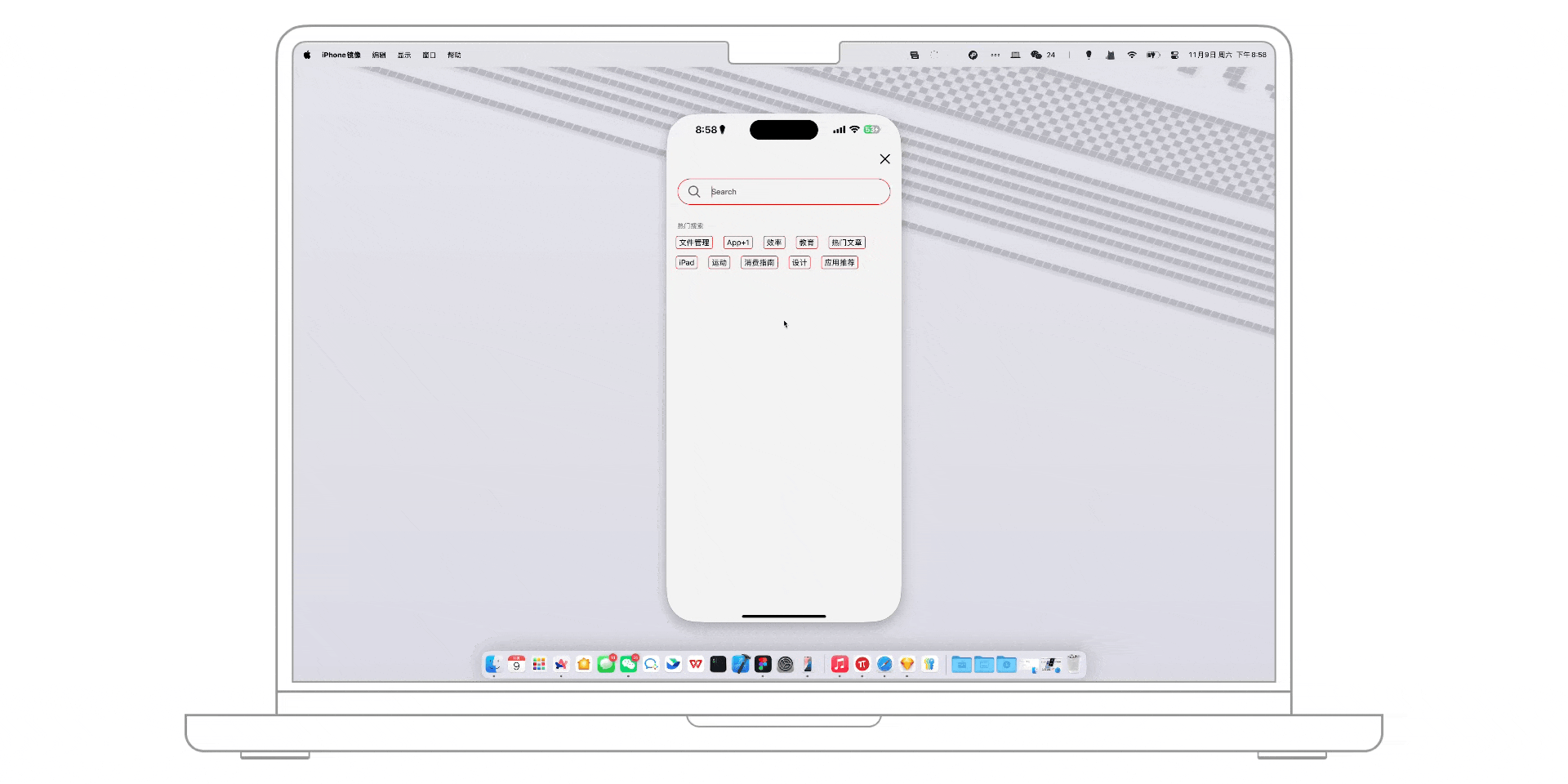 当「iPhone 镜像」App 中正常显示 iPhone 屏幕后,你可以用鼠标左键模拟点按,右键模拟长按(触感触控),用拖拽或滚轮模拟上下滑动。值得一提的是,在浏览图片等需要横向滑动的场景(如小红书、微博)中,你需要使用触控板或支持横向滚动的鼠标(如 Logitech MX Master 系列)。如果没有这些设备,也可以按住 Shift 键并滚动鼠标滚轮来实现横向滑动。