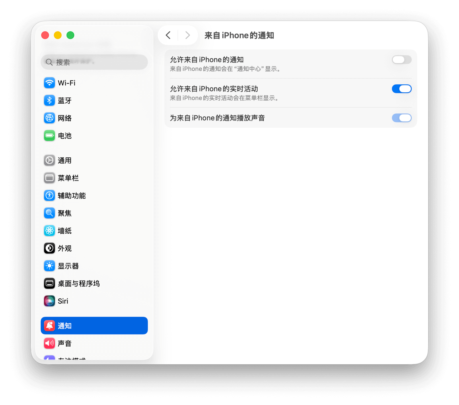 另外,iPhone 上收到的通知可以实时同步到 Mac 的通知中心。点按该通知,「iPhone 镜像」便会自动打开并跳转到相应的 App,大大提高了操作效率。如果你不希望在 Mac 上收到来自 iPhone 的通知,可以在「系统设置 > 通知」中关闭「允许来自 iPhone 的通知」。