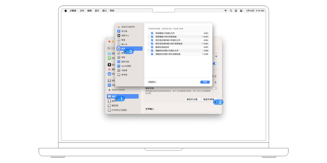 从上面的介绍中可以发现,默认的截图快捷键需要同时用到多根手指,并且键位的分布也很分散。如果你不习惯系统默认的快捷键设置,可以在「系统设置 > 键盘 > 键盘快捷键 > 截屏」里自行设置截图快捷键。