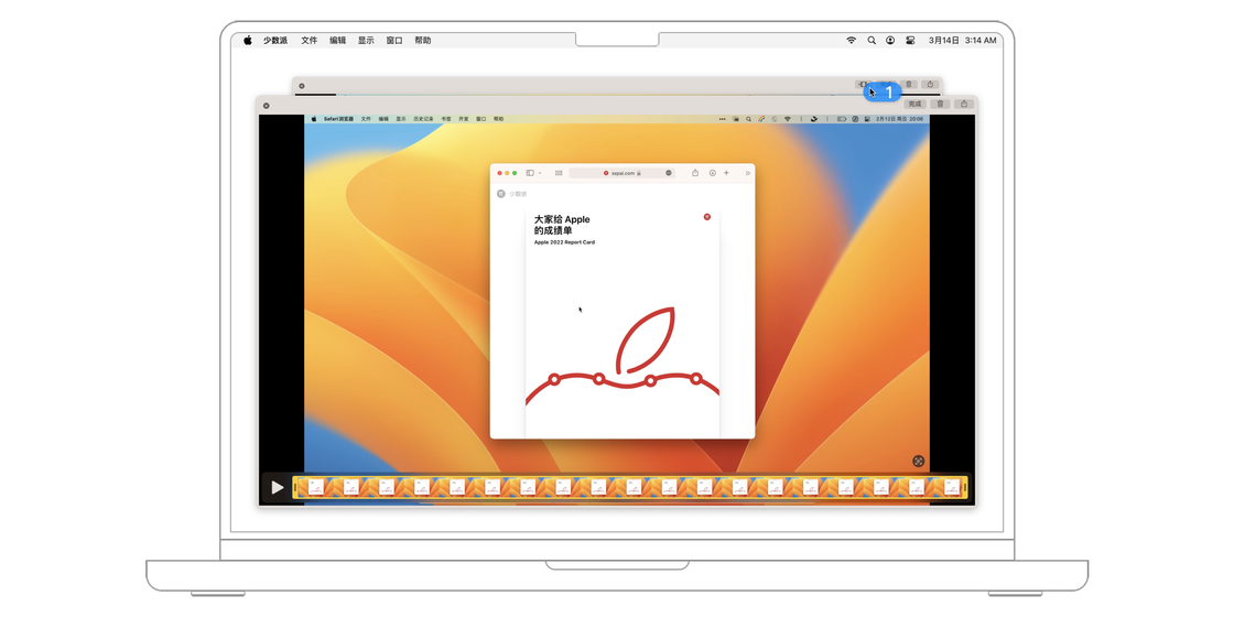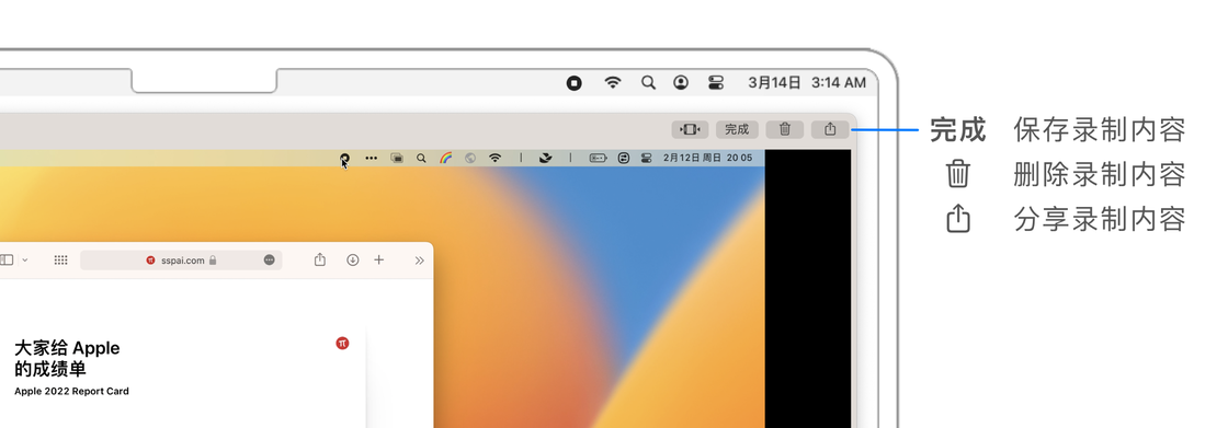 随着视频时代的高速发展,在我们生活和工作中,对录屏的需求频次也会越来越高。macOS 系统方案里的录屏有两种方式,分别是「录制整个屏幕」和「录制所选部分」。和截屏一样,你可以在「选项」菜单中选择录屏结束后的存储位置、录制前倒计时以及录制结束后显示浮动缩略图,还可以选择麦克风来源、为鼠标增加点按效果(对于网课或软件教程录制是个很不错的选择)等。