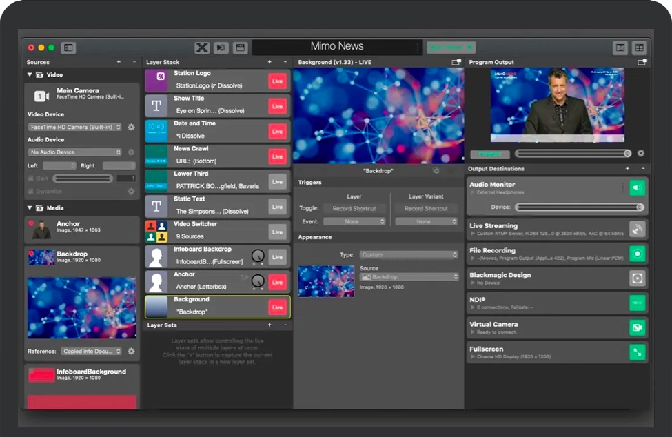 将mimoLive作为强大的图形机器或视频切换器集成到您现有的广播环境中。