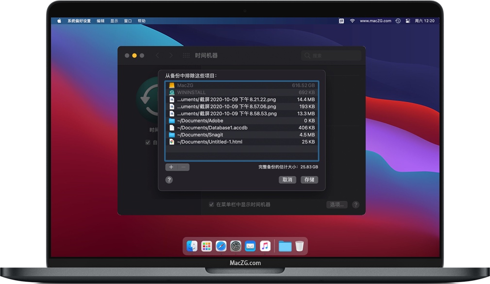 单击加号“+”将驱动器,文件或文件夹添加到“从备份中排除这些项目”列表。 完成添加项目后,点击储存。