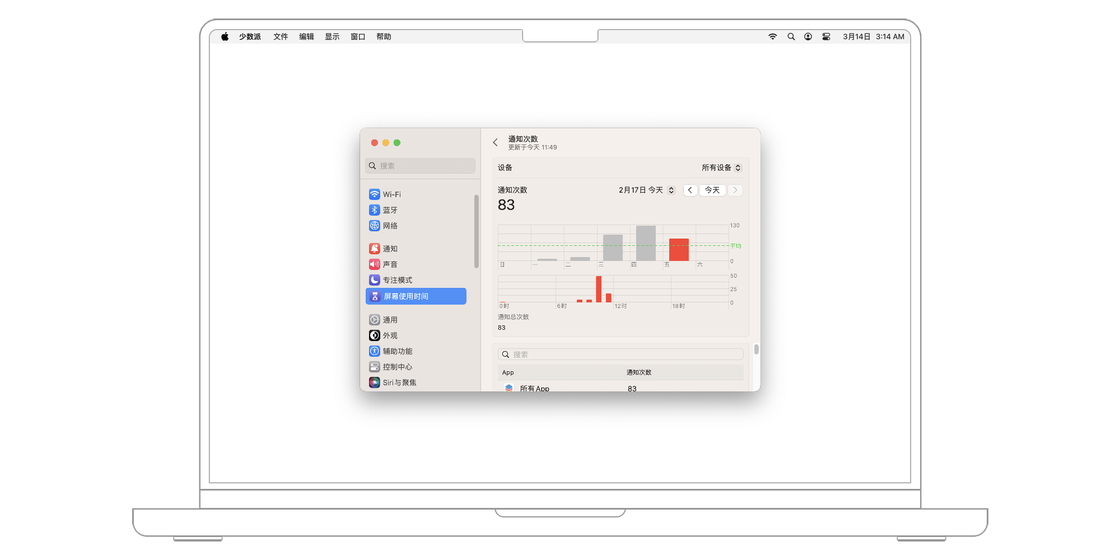 回到「系统设置 > 屏幕使用时间」界面后切换到「通知次数」,可以查看 Mac 收到通知的数量和它们的来源。许多应用会通过推送通知来吸引你的注意。如果一个应用每天都会推送很多无用的消息,你可以考虑关闭它的通知权限。