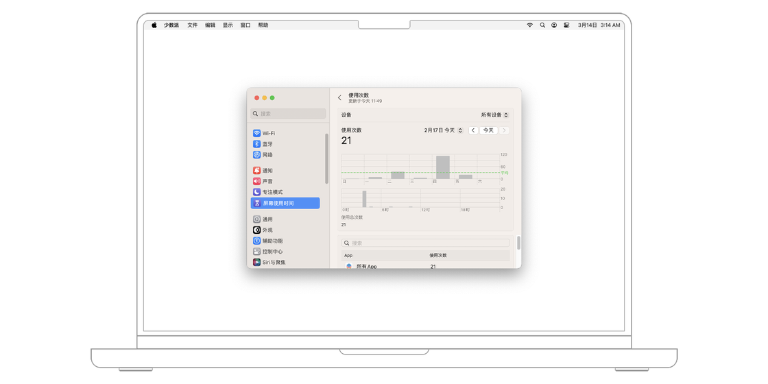 前往「系统设置 > 屏幕使用时间 > App 使用时间」,页面上半部分显示的就是你本周平均每天使用 Mac 的时间。你可以在页面右上角切换周视图和日视图,或者查看本周以前的数据。