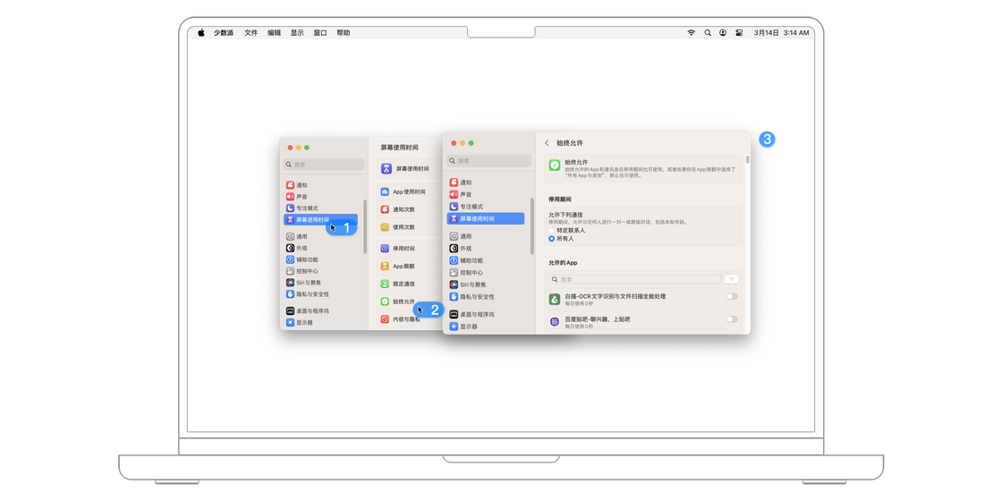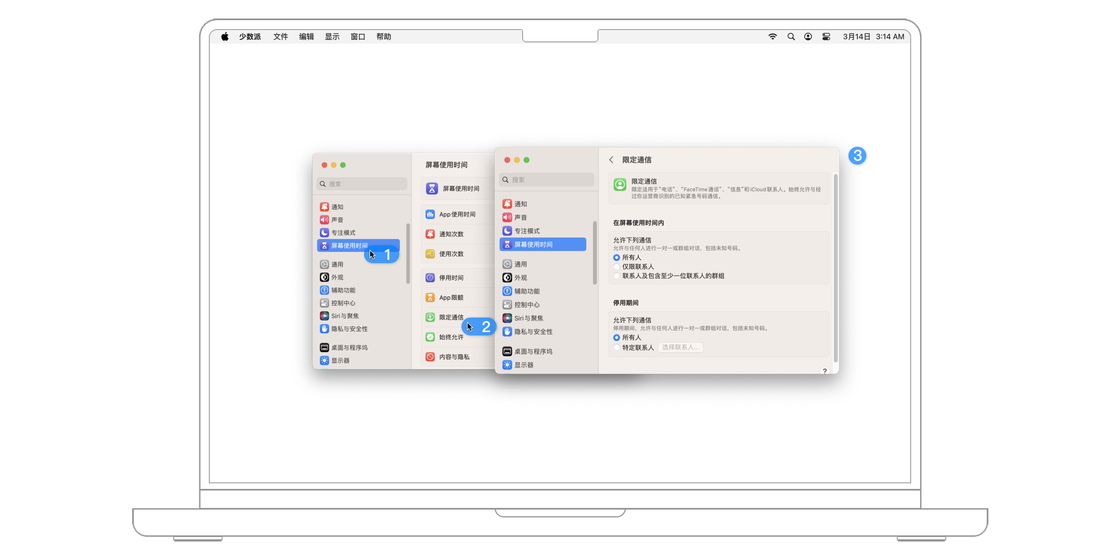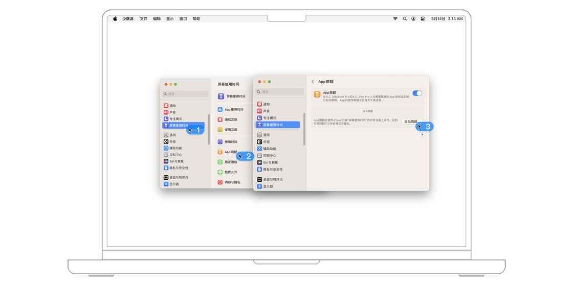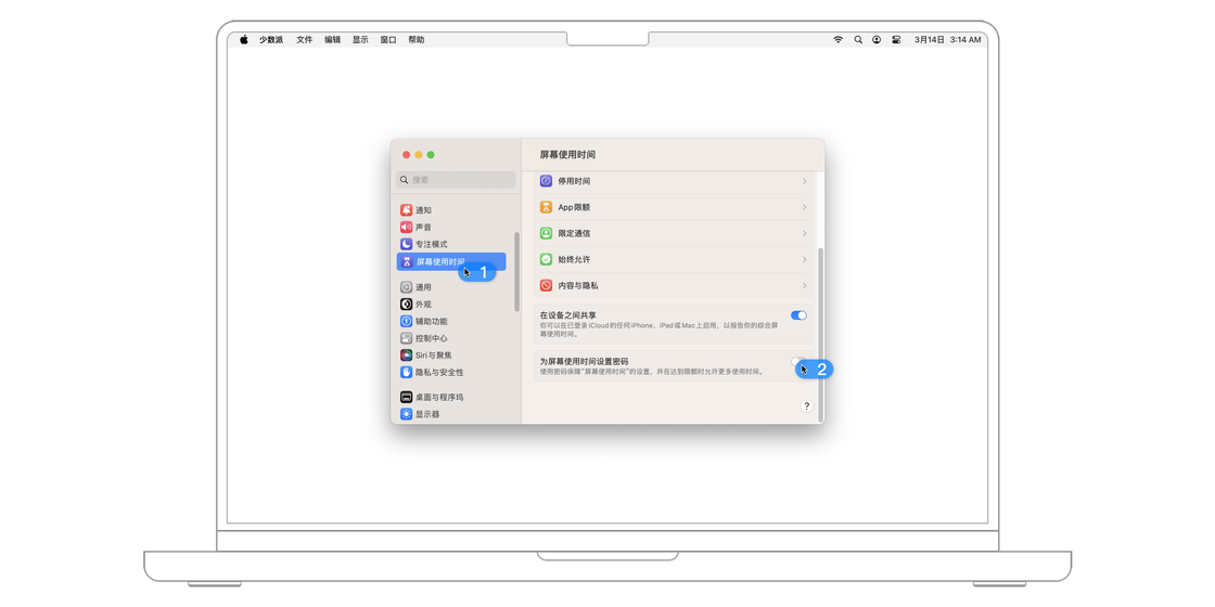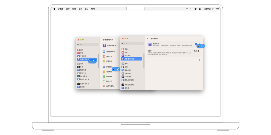 在了解了自己的屏幕使用习惯之后,你可能会想控制自己每天花在 Mac 上的时间。「屏幕使用时间」里就有几样趁手的工具。