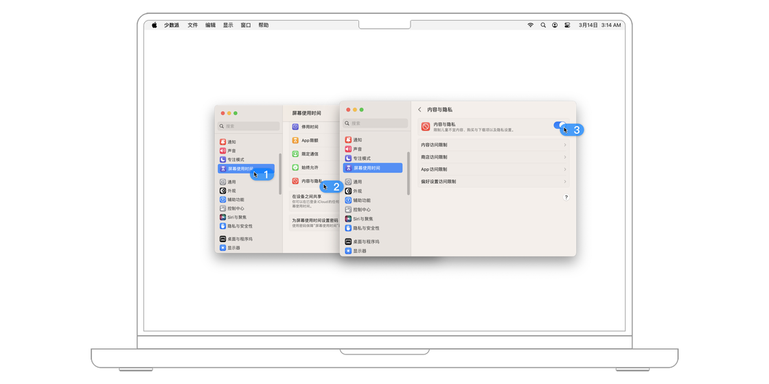 如果你要把 Mac 交给家中的孩子或者老人使用,可以开启这个功能并且设置相关的权限,阻止家人访问不当的内容。