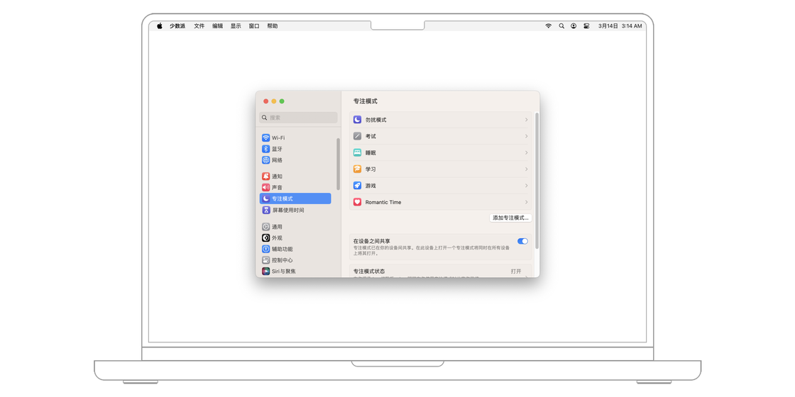 专注模式不仅限于单一设备,用户可以使用 iCloud 让专注模式在我们所有的设备之间进行共享。当我们在一台设备上打开专注模式时,其他设备上也会同步地自动启用该专注模式。