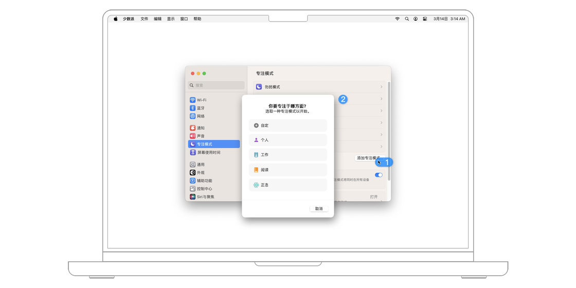从 macOS 13 版本开始,专注模式进入了系统设置的一级菜单。在「系统设置 > 专注模式」中,我们可以通过「添加专注模式」来创建全新的专注模式。